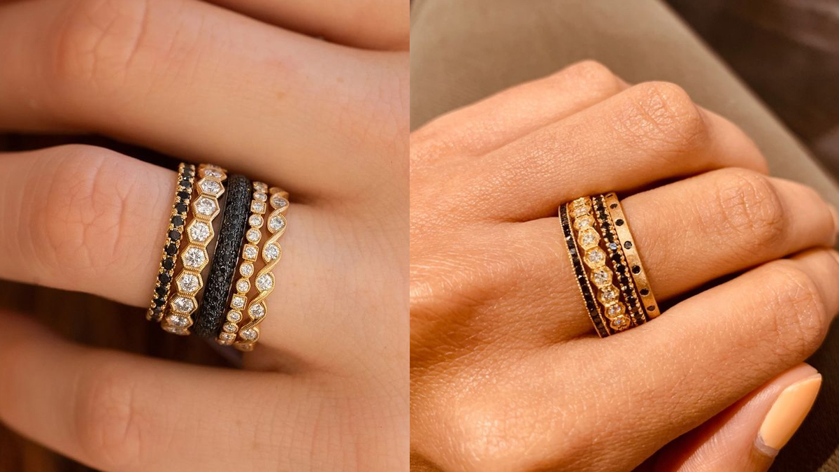 आजकल इस तरह से क्रिस-क्रॉस पैटर्न की रिंग का चलन बहुत ज्यादा है। आप एक साइड गोल्ड और ब्लैक कलर के बीड्स डलवा सकती हैं और दूसरे साइड में डायमंड की एक लेयर डलवा कर इस तरह की क्रिस-क्रॉस पैटर्न की रिंग पहन सकती हैं।