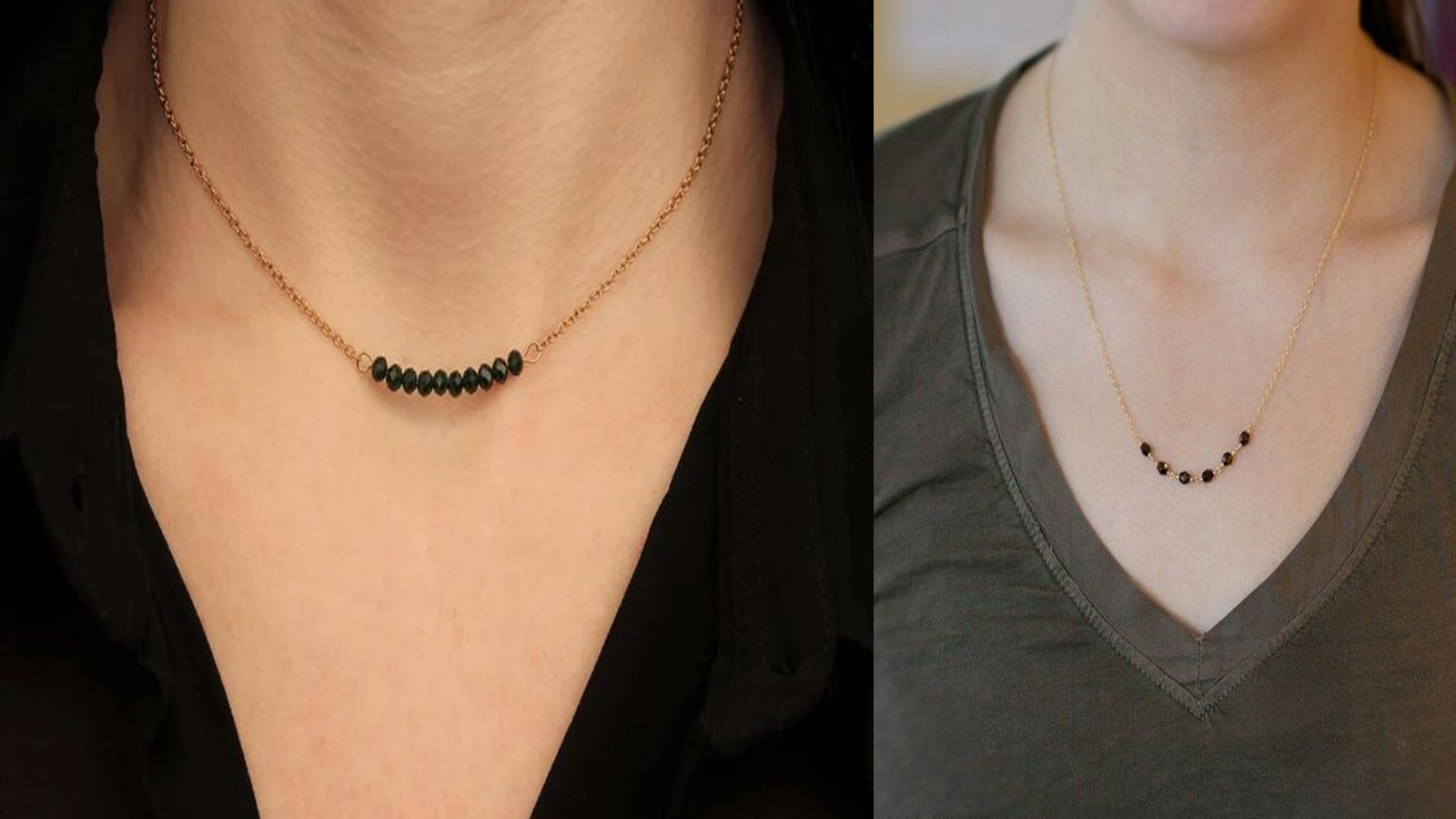 यहां पर मंगलसूत्र के दो डिजाइन दिखाए गए हैं। पतले चेन में जहां एक बीड्स लगे हैं। जो सोने की चमक को फ्लॉन्ट करने में हेल्प कर रही है। वहीं दूसरे में 3 ब्लैक बीड्स और दो गोल्ड बीड्स चेन में पिरोए गए हैं। इस तरह के मंगलसूत्र वर्किंग वुमन की पहली पसंद है। वो ऑफिस में इसे वेस्टर्न आउटफिट के साथ भी पहनकर जा सकती हैं। ट्रेडिशनल के साथ-साथ इस तरह के मंगलसूत्र मॉर्डन लुक भी देते हैं।