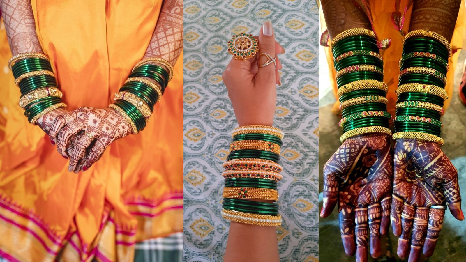 सावन में हरी चूड़ियों के साथ मराठी स्टाइल गोल्ड कंगन का ट्रेंड। जानिए कैसे बनाएं अपने हाथों को सावन सुंदरी जैसा खूबसूरत।