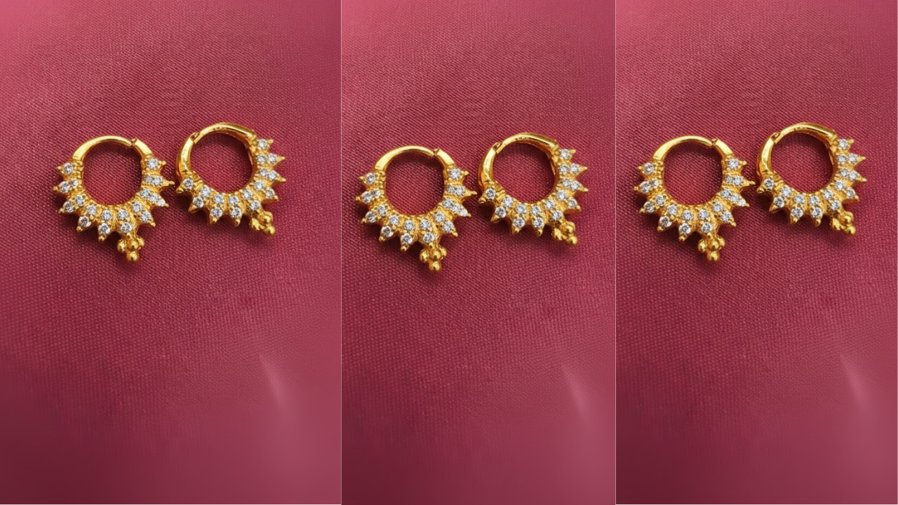 मारवाड़ी कल्चर को शो करते हुए ये हूप बाली बेटी के कानों पर 100% खूबसूरत लगेगी। इसे हाफ मून विद बारीक कारीगरी पर बनाया गया है। साथ में नुकीले पैटर्न विद सफेद नग और प्यारे लग रहे हैं। सबसे नीचे की तफ तीन छोटे-छोटे गोल्डन बीड्स लगे हैं जो झुमका जैसा राजपूती और शाही लुक देता है। सुनार के यहां इस तरह की Bali Earrings in Gold आसानी से अन्य वैरायटी में मिल जाएगी।