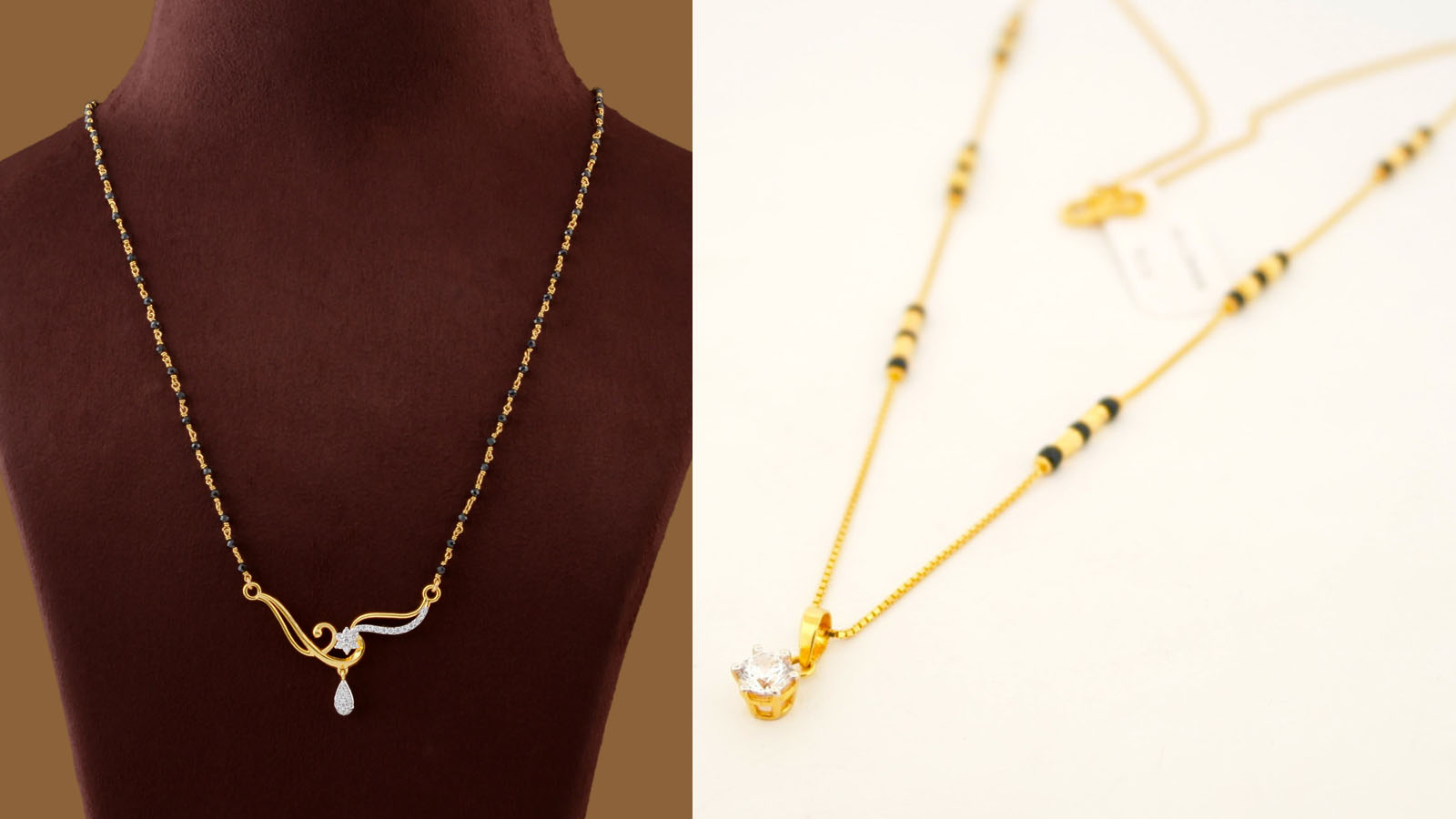 ब्लैक बीड्स पैटर्न के साथ आने वाले मंगलसूत्र हमेशा ही ट्रेंड में रहते हैं। इसमें आप ट्विस्टेड चेन के साथ एक छोटी गोल्डन बॉल की लटकन पैटर्न चुन सकती हैं। यह डिजाइन मिनिमलिस्ट और क्लासी दोनों लगता है।