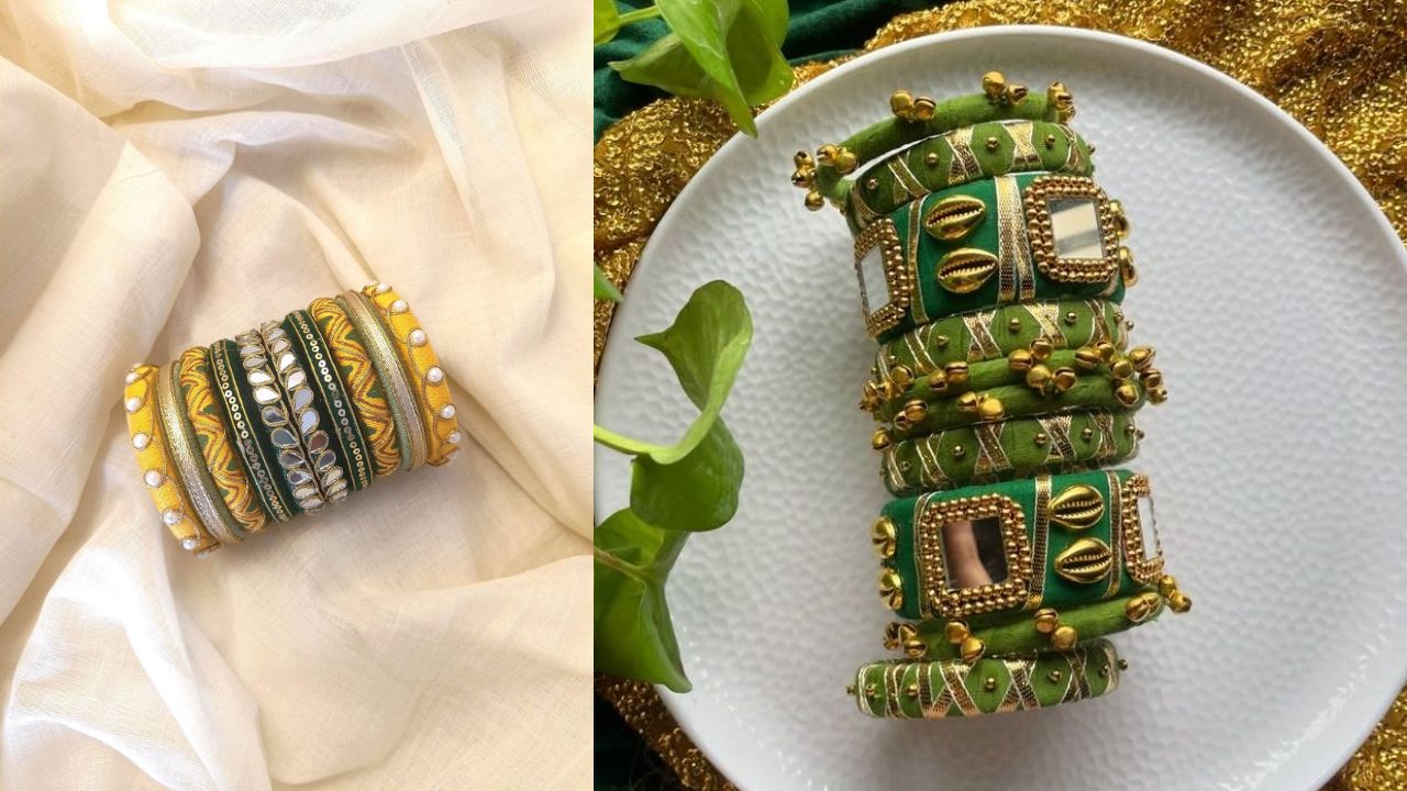 नवरात्रि के समय फैब्रिक बैंगल का चलन बहुत ज्यादा रहता है। लोग अपने आउटफिट के मैचिंग में बैंगल कस्टमाइज करवाते हैं। ऐसे में ये फैब्रिक बैंगल की ये डिजाइन बहुत सुंदर है, जिसे आप भी मिरर, घुंघरू के काम के साथ कस्टमाइज करवा सकती हैं।