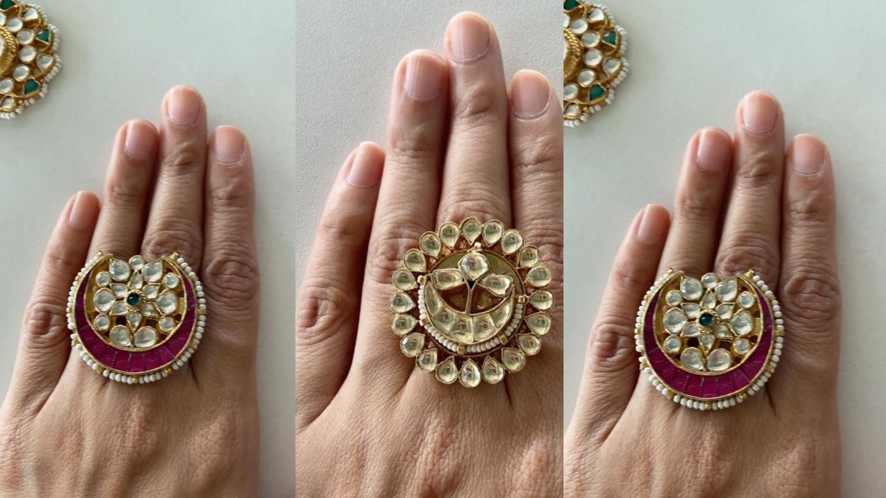 मीनाकारी का काम और चांद सितारे की डिजाइन रिंग को बहुत ब्यूटीफुल और रीच लुक दे रहे हैं। इस तरह के डिजाइन बहुत ही शानदार है, ऐसे पैटर्न राजस्थान में पहना जाता है और हाथों में कमाल लगते हैं।