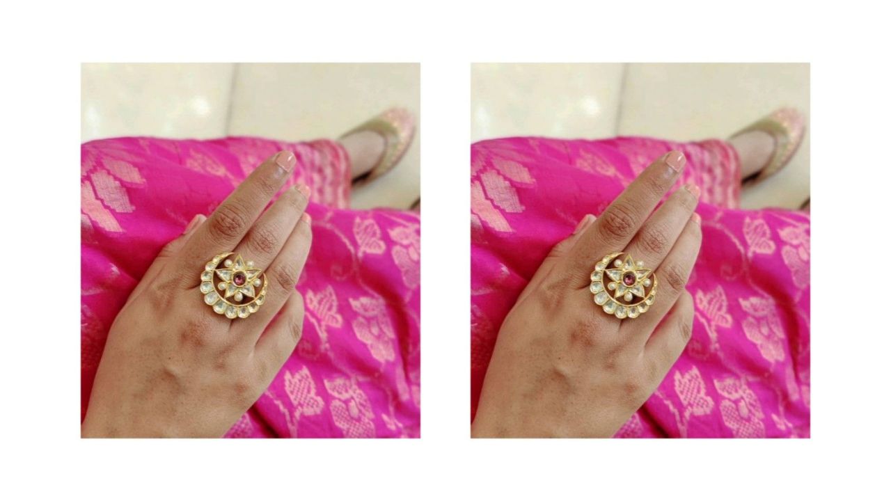 हैवी स्टोन के काम के साथ चांद सितारे रिंग की ये डिजाइन भी बहुत प्यारी है, इस तरह के स्टाइलिश पीस आपको आपके बजट में मिल जाएगी और ये भी आपके लहरिया साड़ी के साथ बहुत सुंदर लगेगी। सावन में पहनने के लिए इसके साथ रजवाड़ी कंगन भी बहुत कमाल लगेगा।