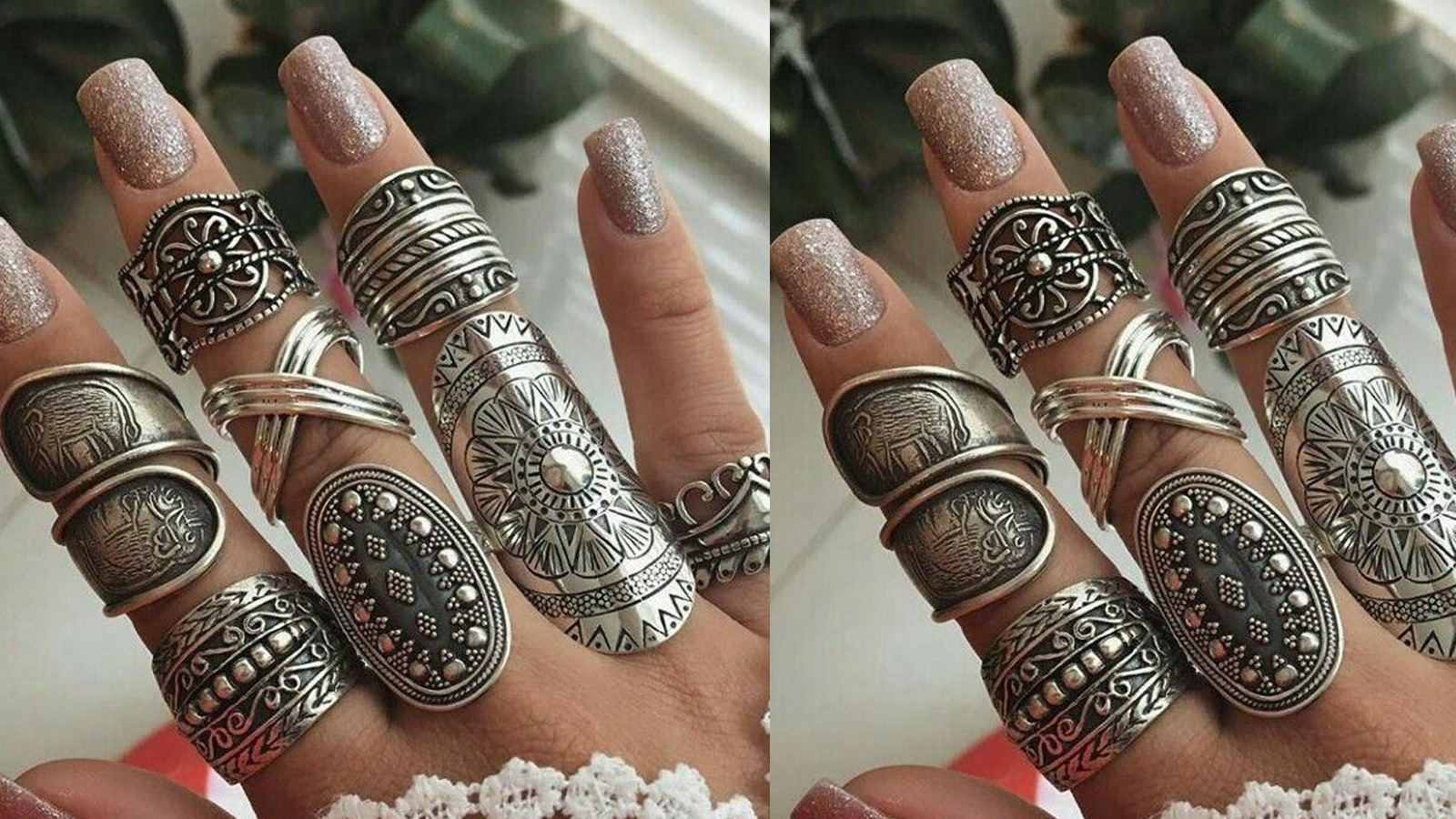 अगर आप अपनी चारों उंगलियों में रिंग पहन कर हैवी लुक चाहती हैं, तो इस तरह की बैंड डिजाइन की ऑक्सिडाइज्ड रिंग चुन सकती है। इंडेक्स फिंगर के लिए बड़ी सी ब्लैक स्टोन वाली रिंग और मिडिल फिंगर के लिए जालीदार पैटर्न की रिंग चुनें। इस तरह की रिंग का सेट आपको ऑनलाइन आसानी से 400 से ₹500 का मिल जाएगा। आप सिंगल-सिंगल रिंग भी खरीद सकती हैं।