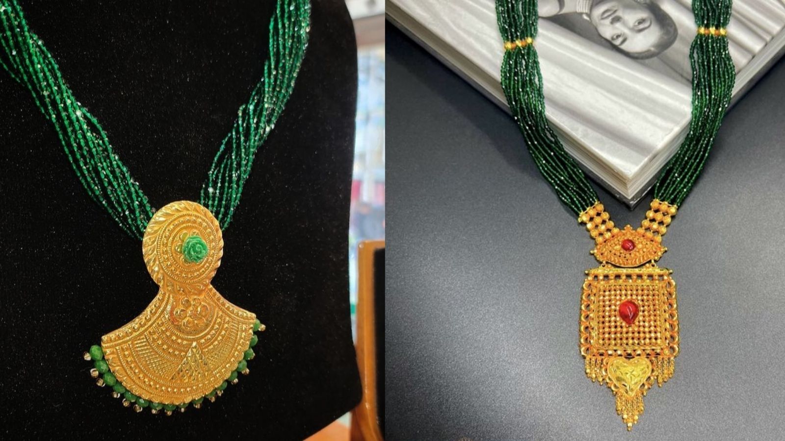 पहाड़ी मंगलसूत्र के पारंपरिक और आधुनिक डिज़ाइनों की एक झलक। तिलहरी, ढोलना पेंडेंट, और हैवी पेंडेंट जैसे विभिन्न डिज़ाइन शामिल हैं।