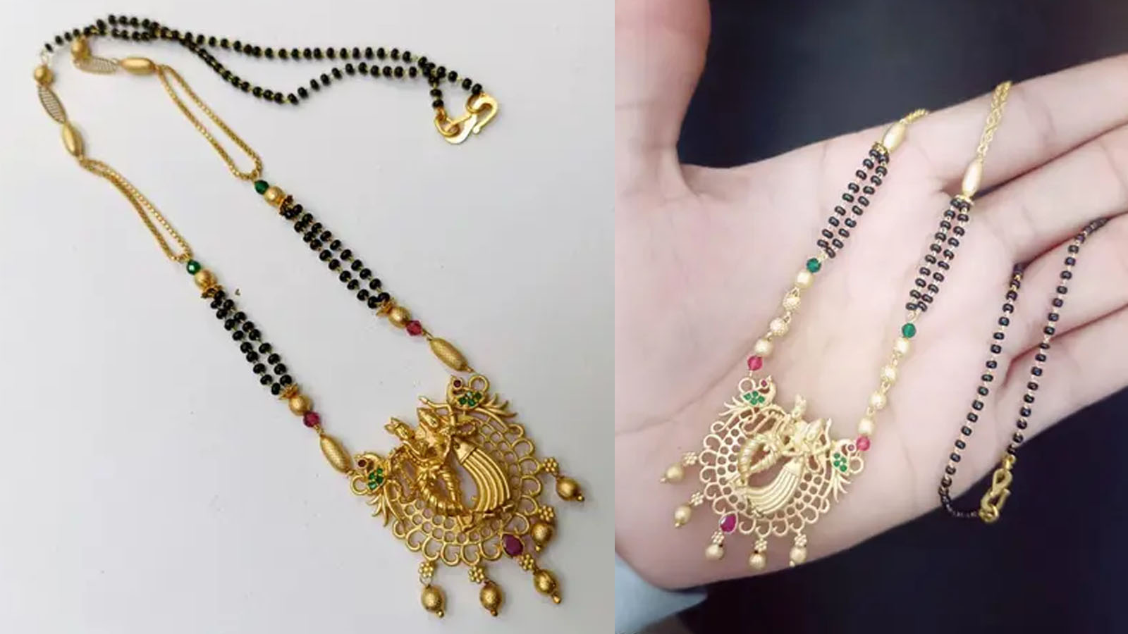 इस डिजाइन में गोल्ड का एक छोटा सा गोल पेंडेंट होता है, जिस पर राधा-कृष्ण की आकृति बारीकी से उकेरी जाती है। पेंडेंट के चारों ओर मिनी गोल्ड बीड्स लगाकर इसे फिनिशिंग दी जाती है। ब्लैक बीड्स की पतली चेन इसे सिंपल और एलीगेंट बनाती है।