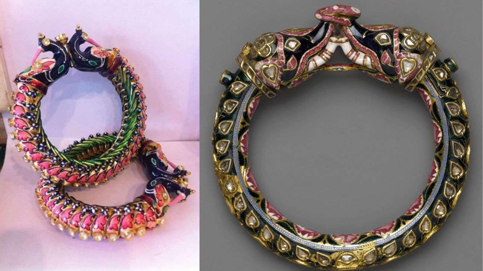 रजवाड़ी स्टाइल में कड़ा की ये दो डिजाइन है, जिसमें एक हाथी मुंह है, तो दूसरा मयूर मुंह वाला डिजाइन है। इन दोनों ही डिजाइन में मीनाकारी, नग और कुंदन का काम है, जो इस कड़ा को रजवाड़ी लुक दे रहा है।