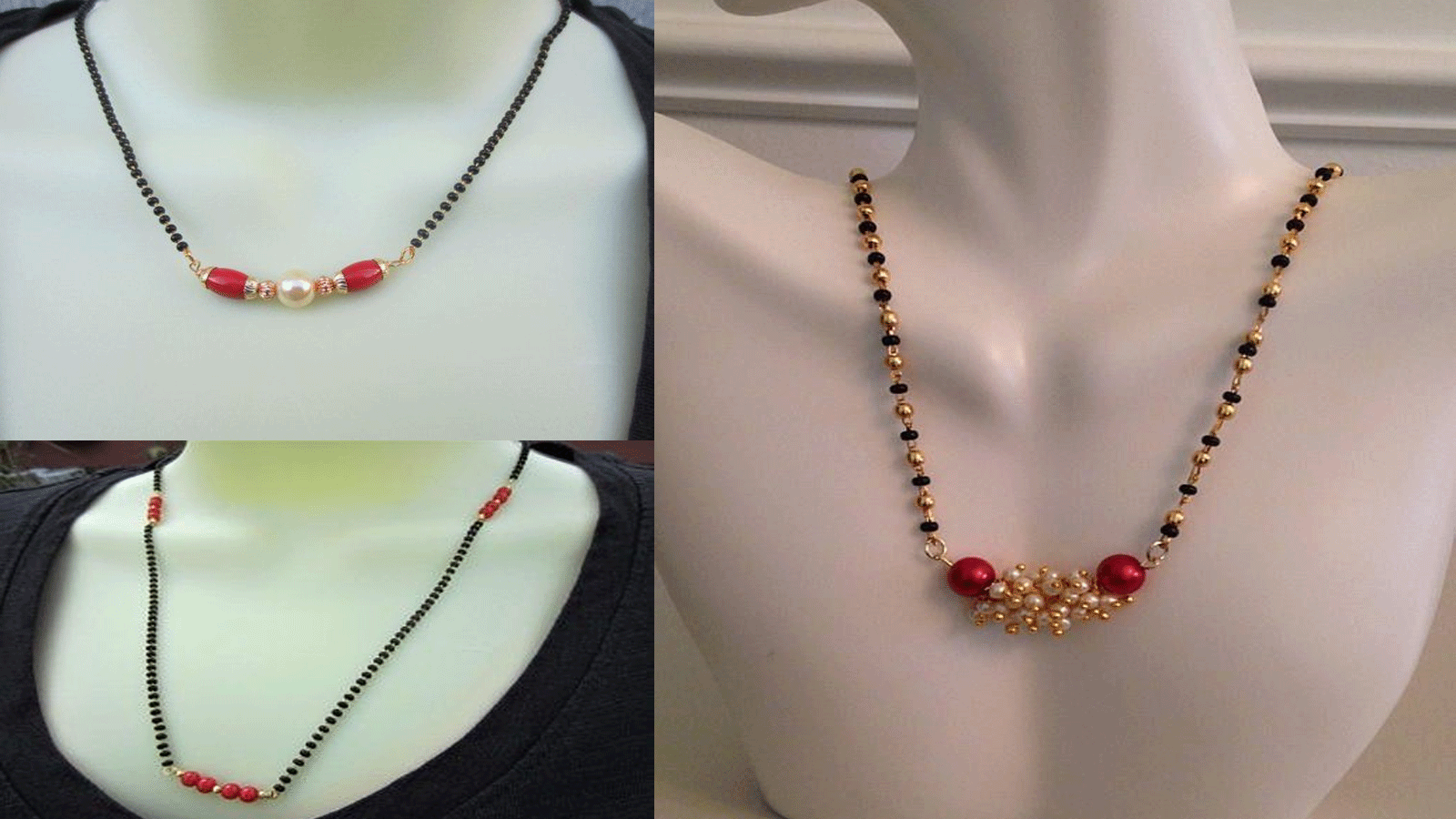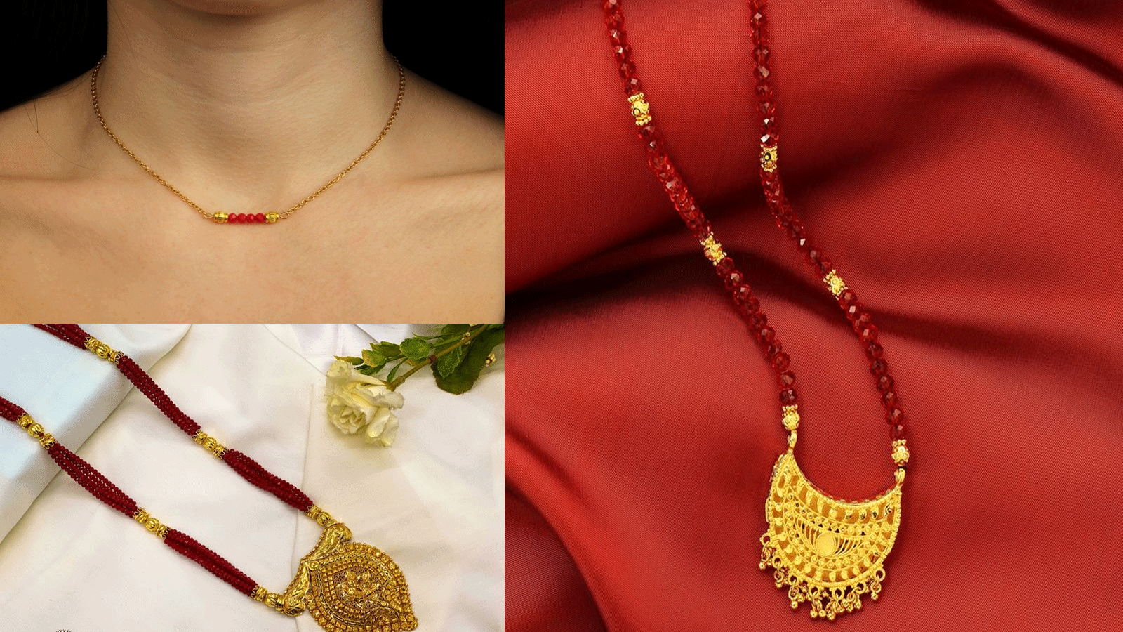लाल रंग प्यार और ऊर्जा का प्रतीक माना जाता है। अगर इसे जोड़कर मंगलसूत्र बनाया जाता है तो सुहाग का रंग और भी गहरा हो जाता है। लाल मोती से बने 3 डिजाइंस यहां दिखाए गए हैं। लाल और गोल्ड मोती के साथ हैवी लॉकेट लगाया गया है। वहीं गोल्ड चेन में चार मोती लगाकर मिनिमल मंगलसूत्र डिजाइंस दिखाए गए हैं। आप अपने बजट के मुताबिक इस तरह के मंगलसूत्र खरीद सकती हैं।