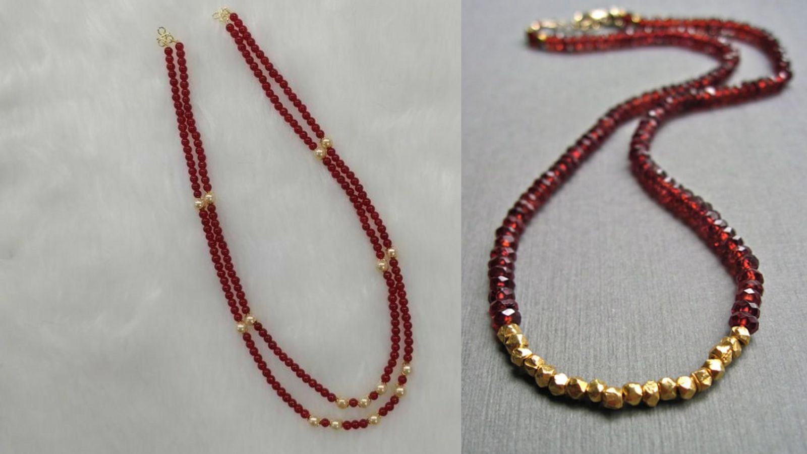 मंगलसूत्र हर सुहागन की पहचान है, हिंदू धर्म में मंगलसूत्र का पहचान सुहाग से जोड़ा जाता है। भारत के हर राज्य की हिंदू महिला अपने-अपने परंपरा के अनुसार मंगलसूत्र पहनती हैं। बॉलीवुड के सेलेब्स भी शुभ अवसर और साड़ी सूट के साथ अपने सुहाग की निशानी मंगलसूत्र को पहनती हैं। भारतीय हिंदू महिला अपने सामर्थ्य के अनुसार मंगलसूत्र अपने गले में जरूर पहनती हैं। बता दें कि बहुत से जगहों में साल भर तक काले रंग का इस्तेमाल नई दुल्हन नहीं करती हैं। ऐसे में सुहाग की निशानी मंगलसूत्र को भी महिलाएं काले मोती में नहीं पहनती हैं। इसलिए आज हम आपके लिए आपकी सुहाग की निशानी यानी मंगलसूत्र में लाल मोती में कुछ यूनिक डिजाइन लाए हैं।