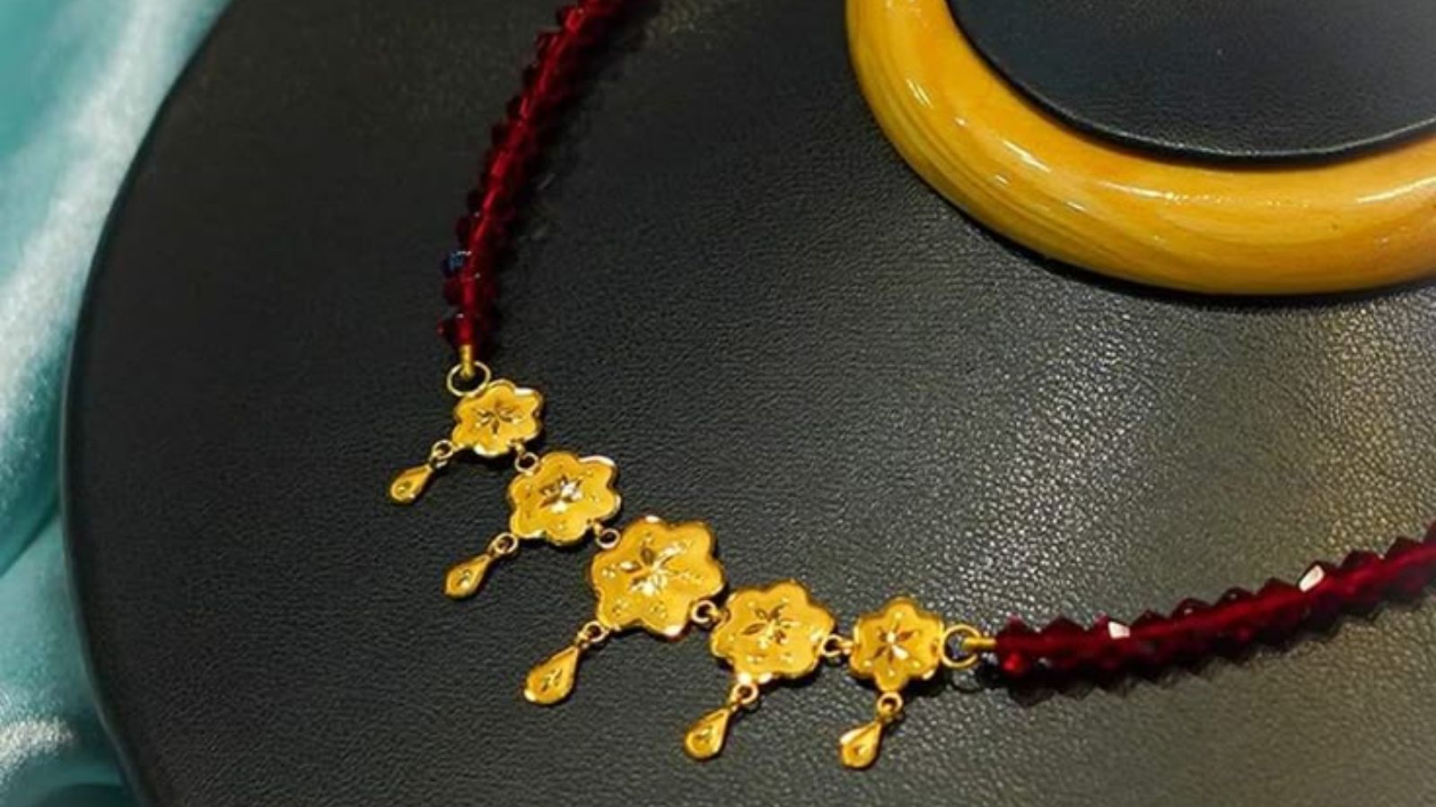 ट्रेडिशनल गोल्ड पेंडेंट के साथ लाल मोती मंगलसूत्र