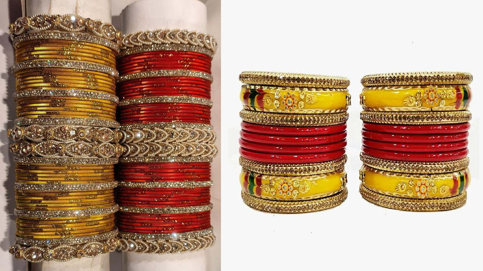 अगर आप थोड़ा हैवी और ग्लैमरस लुक चाहती हैं, तो स्टोन वर्क वाली लाल-पीली कांच की चूड़ियां बेस्ट ऑप्शन हैं। इनमें छोटे-छोटे चमकीले स्टोन लगे होते हैं, जो हाथों को शाइनी लुक देते हैं। यह डिजाइन नई दुल्हन के लिए खास मौकों पर पहनने के लिए परफेक्ट है।