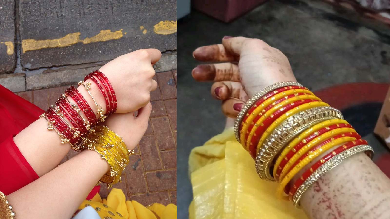 Newlywed Bride Bangles: शादी के बाद नई नवेली दुल्हन के हाथों में चूड़ियों की खनक एक अलग ही रौनक लेकर आती है। खासकर लाल-पीली कांच की चूड़ियां भारतीय परंपरा, शुभता और नए रिश्ते की मिठास का खूबसूरत प्रतीक मानी जाती हैं। ये सिर्फ एक ज्वेलरी पीस नहीं, बल्कि दुल्हन के सोलह श्रृंगार का अहम हिस्सा हैं। अगर आप भी शादी के बाद अपने ब्राइडल लुक को और खास बनाना चाहती हैं, तो ये 5 शानदार लाल-पीली कांच की चूड़ी डिजाइन आपके लिए परफेक्ट हैं।