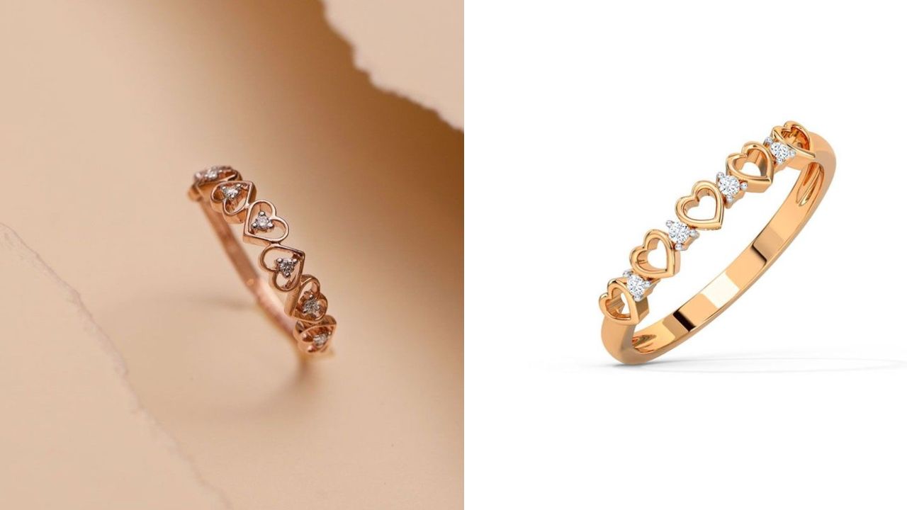 हार्ट शेप में रोज गोल्ड बैंड की ये डिजाइन आप राखी में बहन से लेकर, गर्लफ्रेंड डे में गर्लफ्रेंड को प्रपोज करने के लिए ले सकती हैं। हार्ट के बारीक शेप और स्टोन का सुंदर काम इस रिंग की सुंदरता को बढ़ा रहा है।