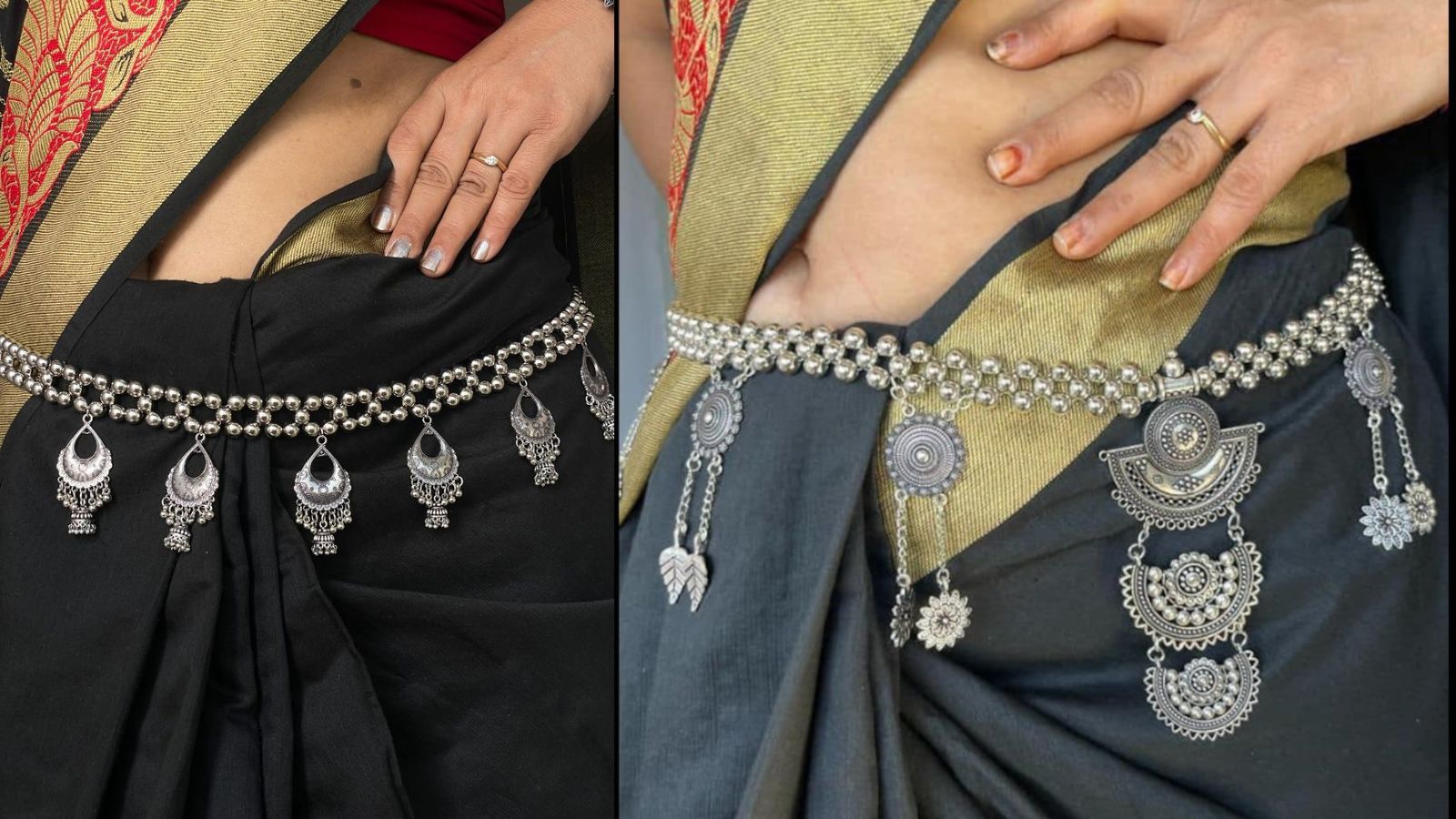 सावन में लहरिया और बांधनी साड़ी के साथ सिल्वर कमरबंद पहनकर पाएं खूबसूरत लुक। घुंघरू, लटकन और प्लेन डिज़ाइन में उपलब्ध ये कमरबंद हरियाली तीज पर आपकी खूबसूरती में चार चांद लगा देंगे।