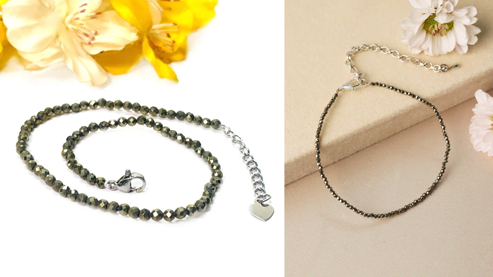 अगर आपको स्लीक के साथ थोड़ा ट्रेंडी वाइब चाहिए, तो यह परफेक्ट है। इसमें पाइराइट बीड्स के बीच छोटे फ्लैट सिल्वर डिस्क लगे होते हैं जो इसे मॉडिश लुक देते हैं। यह डिजाइन इंस्टाग्राम स्टाइल एस्थेटिक लुक देता है और इंडो-वेस्टर्न आउटफिट पर सुपर स्टाइलिश लगता है।