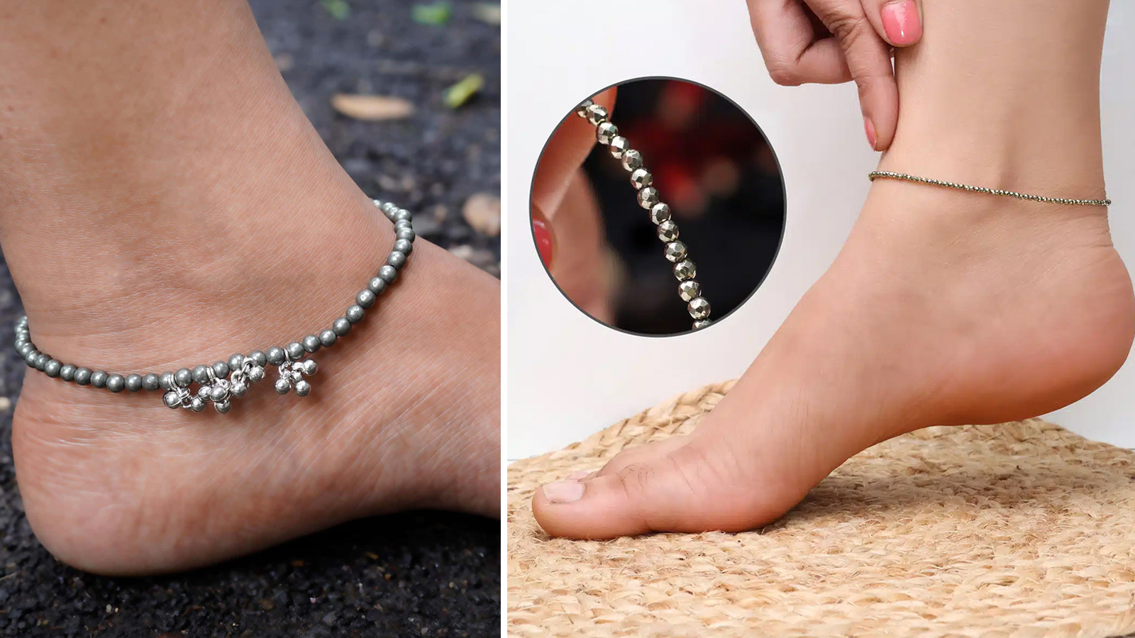 यह सबसे ज्यादा पसंद किया जाने वाला डिजाइन है। इसकी पतली सिल्वर चेन में छोटे-छोटे गोल्डन पाइराइट बीड्स लगाए जाते हैं, जो लाइट से बहुत सुंदर चमक देते हैं। ये एंकलेट कॉलेज, ऑफिस और कैजुअल आउटफिट सबके साथ मैच हो जाता है। सॉफ्ट ग्लो देता है और पैरों में सटल एलिगेंस ऐड करता है।