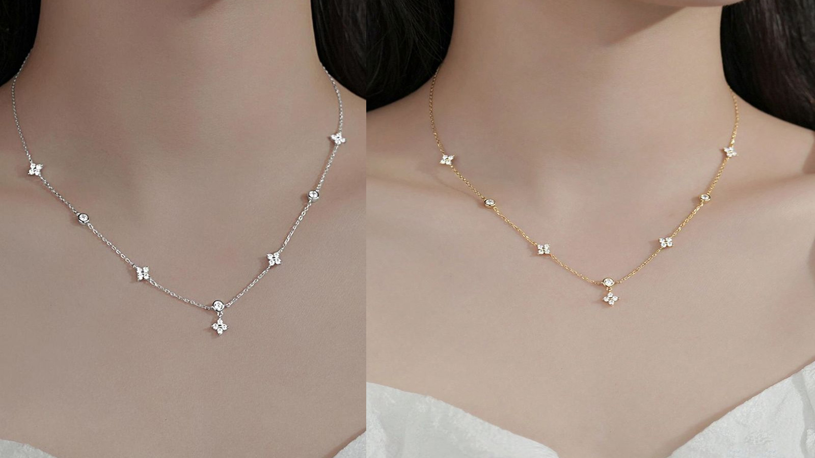 सिंपल लेकिन क्लासिक लुक के लिए आप इस तरह के सिल्वर चेन खरीद सकती हैं। यहां पर नग लगे दो डिजाइंस दिखाए गए हैं। एक डिजाइन सिल्वर में हैं। वहीं दूसरे पर गोल्ड प्लेटिंग की गई है। 5 ग्राम के अंदर आप इस चेन को खरीद सकती हैं। जिसकी कीमत 4 हजार के अंदर होगी।