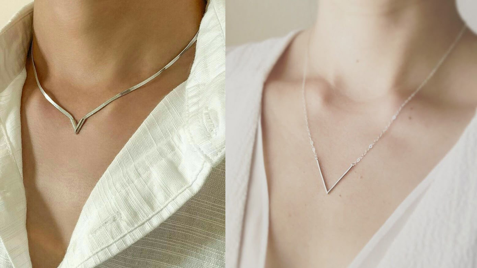 प्लेन चेन की जगह इस में थोड़ा सा ट्विस्ट ऐड कर दिया जाता है। जिसकी वजह से ये और भी ज्यादा खूबसूरत लगता है। यहां पर सिल्वर चेन के दो डिजाइंस दिए गए हैं जिसमें वी शेप पेंडेंट लगाया गया है। डेली वियर के लिए आप इस तरह के डिजाइंस भी चुन सकते हैं। बहन को देने के लिए यह परफेक्ट गिफ्ट है।
