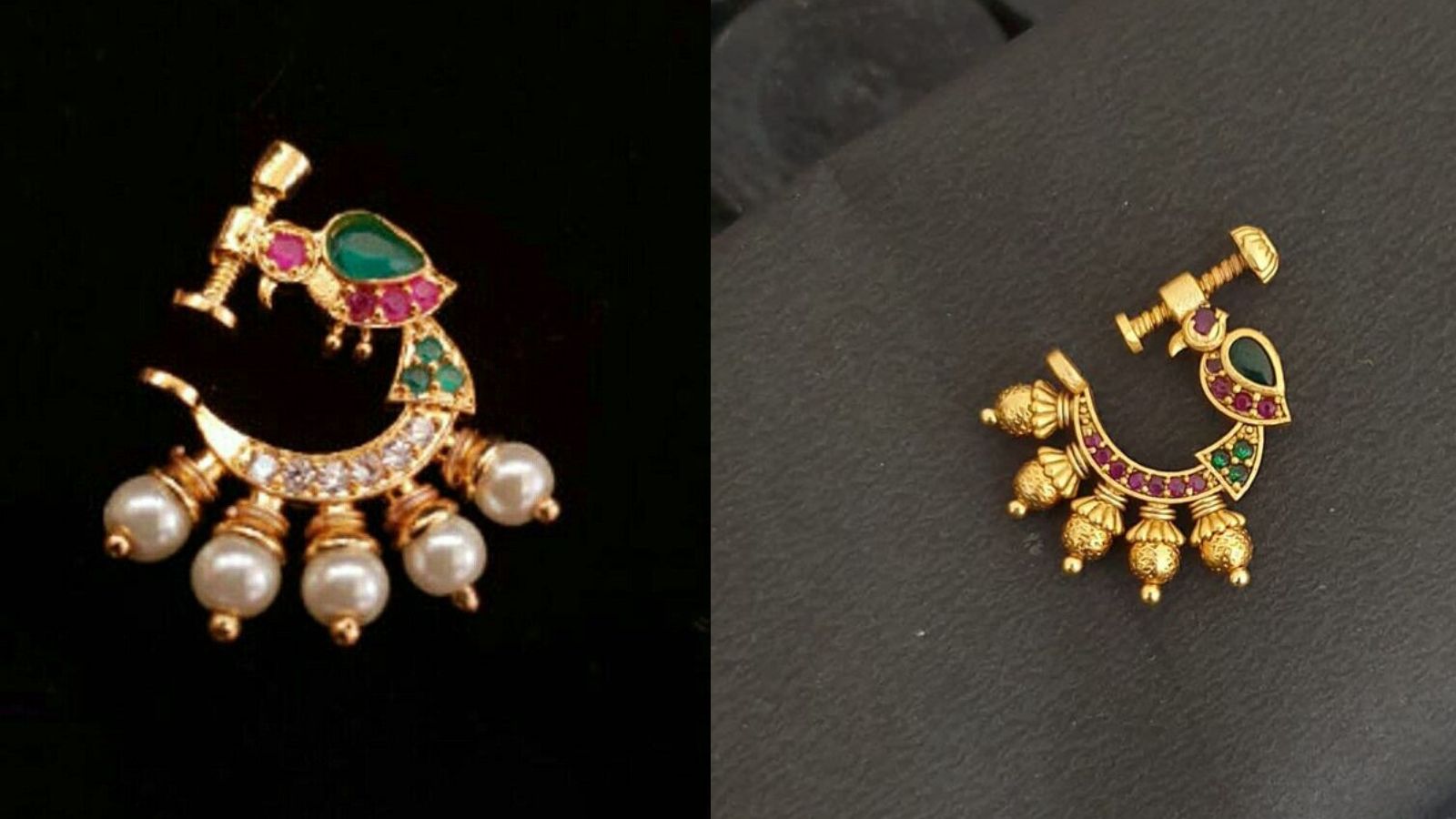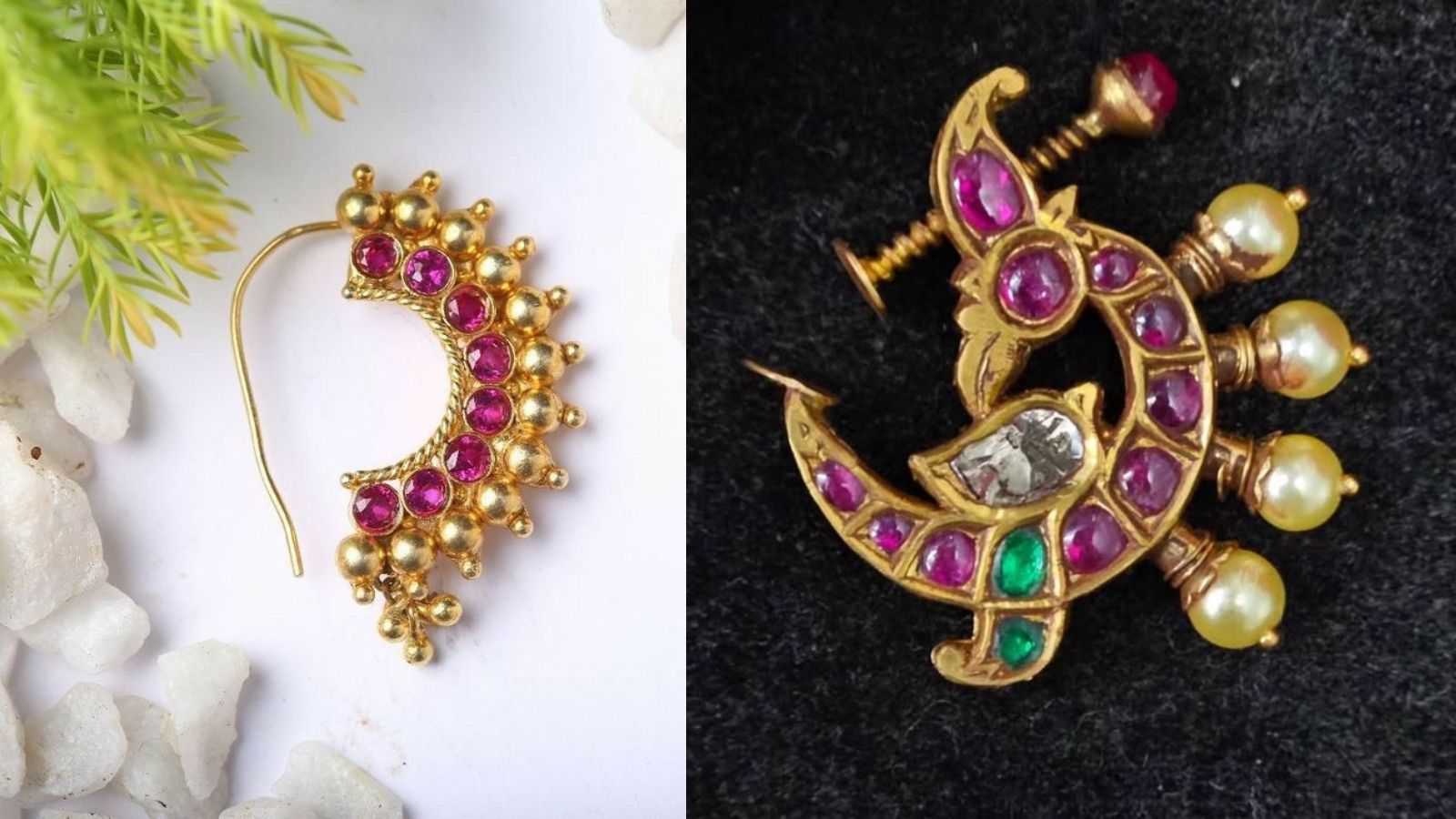 गोल्ड नथ में ये साउथ इंडियन स्टाइल दो तरह से मिल जाएंगे, एक में स्टोन का काम और एक में कुंदन का काम है। एक आपको पियरसिंग पैटर्न में मिलेगा और दूसरा नॉन पियरसिंग पैटर्न में है, जो नाक पर खूब जचेगा।