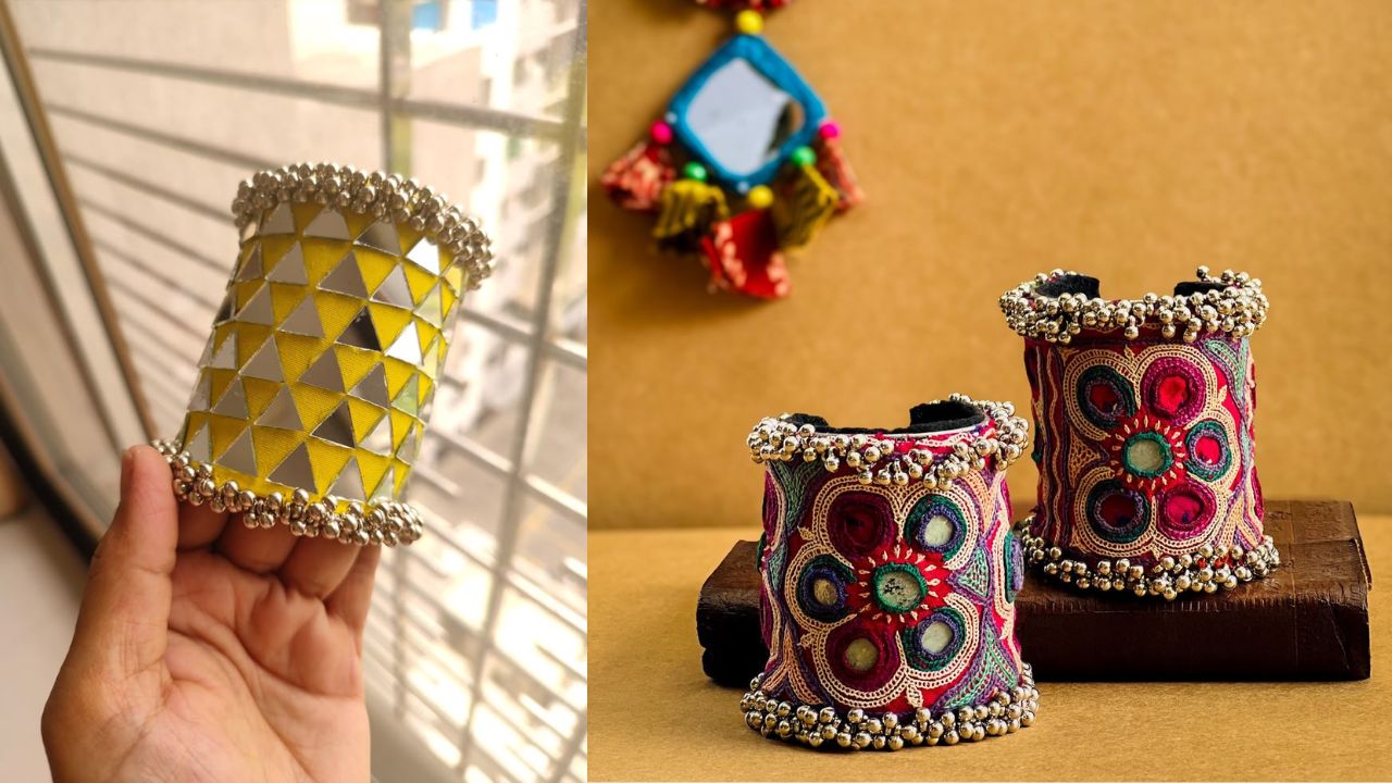 नवरात्रि का जिक्र हो और मिरर वर्क का नाम न आए, ऐसा तो हो ही नहीं सकता। फैब्रिक से बना हुआ कफ ब्रेसलेट का ये डिजाइन बहुत प्यारा और सुंदर है, इसमें मिरर वर्क और छोटे-छोटे घुंघरू लगे हैं, जो डांडिया नाइट्स के लिए बेस्ट हैं। जब आप डांस करती हैं तो इन घुंघरुओं की हल्की-सी झनकार आपके लुक और मूव्स में और चार चांद लगा देती है।