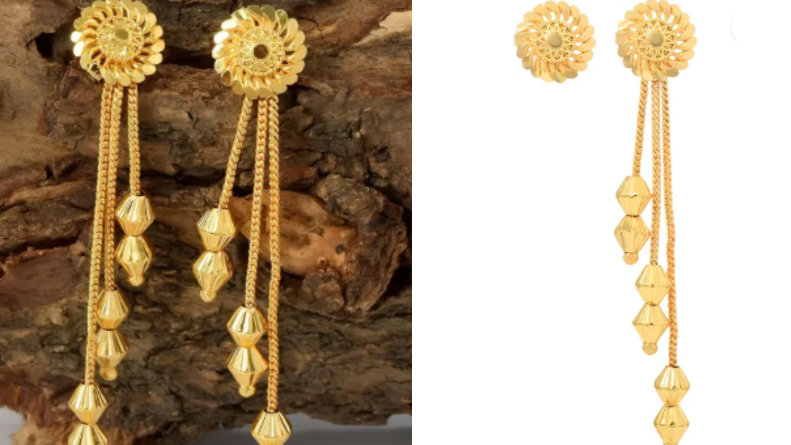 झुमकी स्टाइल ऐसी गोल्ड प्लेटड सुई धागा इयररिंग्स भड़कीला लुक देने के साथ एथनिक आउटफिट के साथ खूबसूरत लगते है। ये डिजाइन सोने पर बनवाना आसान नहीं है। ऐसे में आप आर्टिफिशयल पैटर्न वाला ऐसा खूबसूरत डिजाइन चुन सकती है। फ्लिपकार्ट से इसे 83% ऑफर के बाद 145 रुपए में खरीदा जा सकता है।