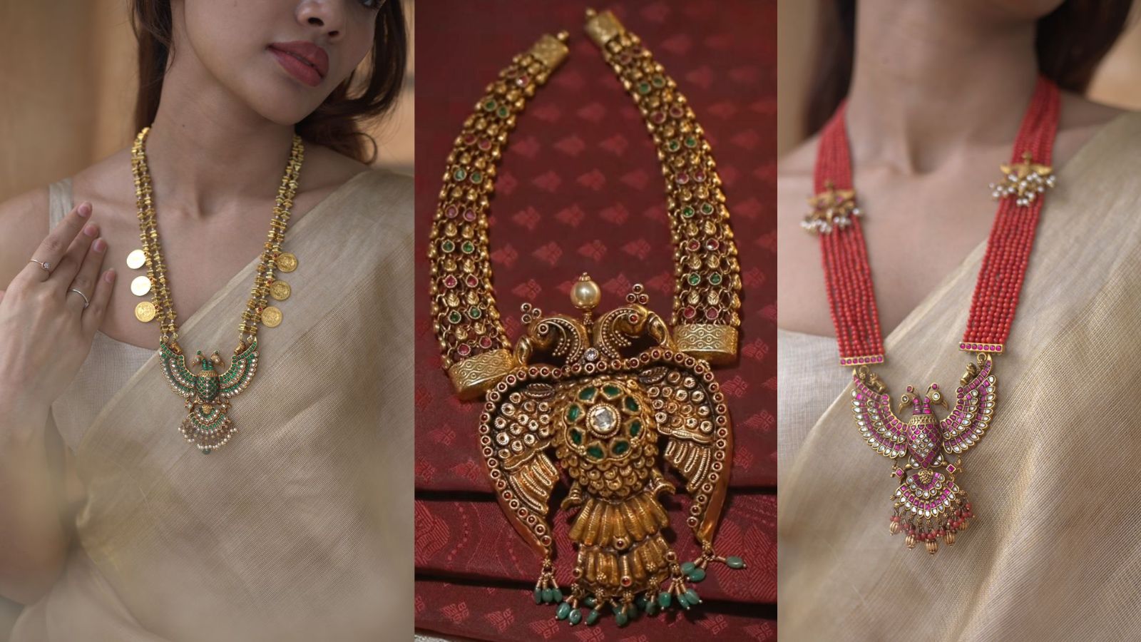 सावन में हरी साड़ी के साथ खूबसूरत टेंपल नेकलेस पहनकर अपना रूप निखारें। हसली, लॉन्ग, चोकर और गंडभेरुंड जैसे विभिन्न डिज़ाइनों में उपलब्ध ये हार आपको देंगे रॉयल लुक।