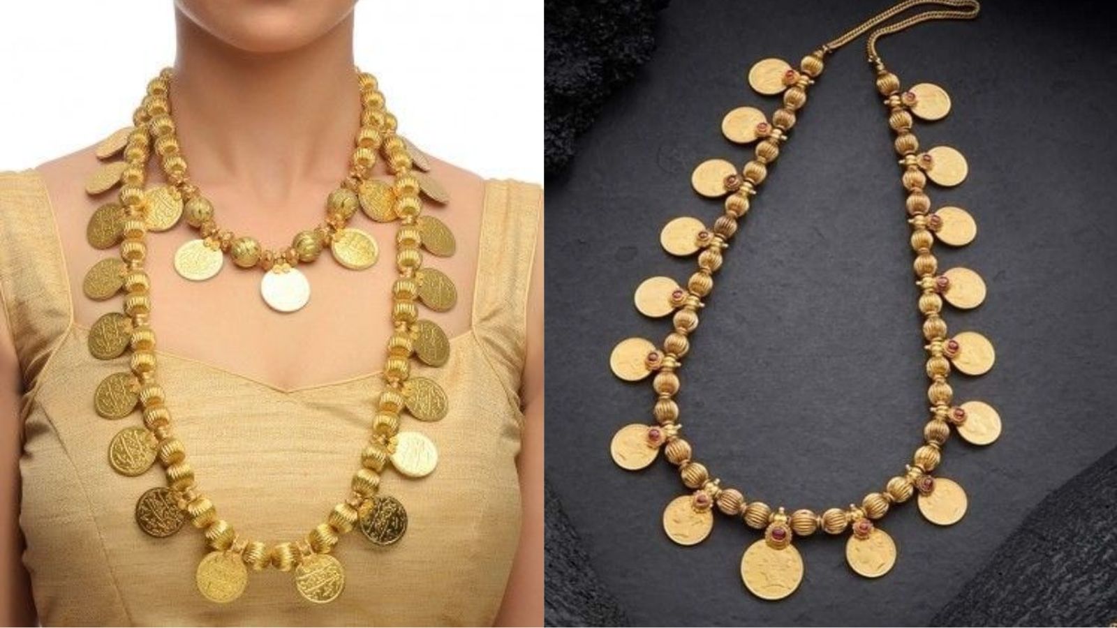 पुतली हार के साथ गोल्डन बीड्स की ये डिजाइन भी आपको हैवी लुक देगी। अर आपके पास बजट अच्छा है तो आप इस डिजाइन के लिए जा सकते हैं। इसके अलावा ये आपको आर्टिफिशियल में भी ले सकते हैं। पुतली हार के साथ ये सुनहरे मोती नौवारी साड़ी और हरी चूड़ी के साथ ये साड़ी को शानदार लुक देगा।