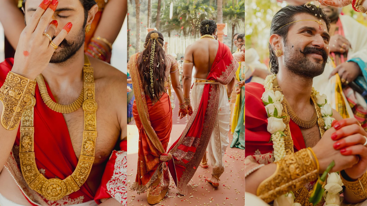 Vijay Deverakonda Wedding Jewelry Photos: विजय देवरकोंडा और रश्मिका मंदाना शादी के बंधन में बंध गए हैं। ये विवाह केवल दो सितारों का नहीं था, बल्कि इंडियन मैरिज के फैशन में बड़ा बदलाव है। पिछले कुछ सालों में सेलिब्रिटीज के बीच मिनिमल कलर और ज्वेलरी का चलन था, लेकिन विजय ने इसे बदलते हुए नया गोल दिया। उन्होंने टिपिकल शेरवानी की बजाय धोती पहनीं, हालांकि सबसे ज्यादा ध्यान 22 कैरेट जूलरी खींचा। एक्टर ने हार से लेकर, बाजूबंद, इयररिंग्स और कड़ा पायल स्टाइल, जो अभी तक किसी भी मेल सेलिब्रिटी क वर्सेटाइल लुक है।