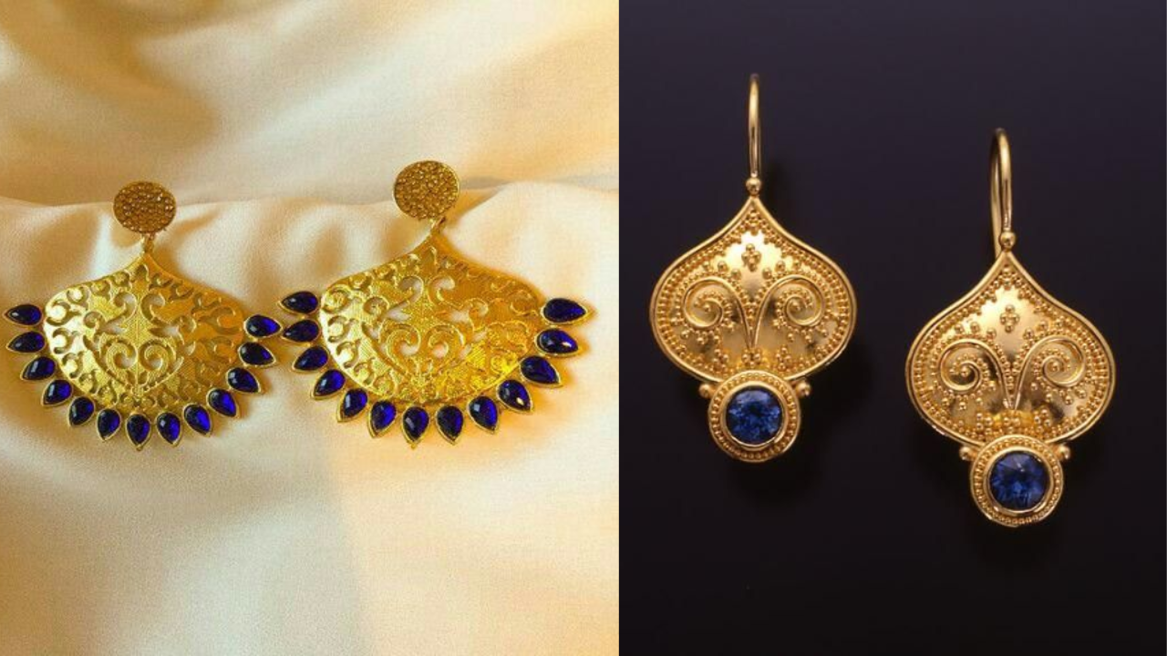 ये विंटेज चांदबाली पंखे जैसी डिजाइन पर है। यहां गोल्ड बेस के साथ जालीदार-इंग्रेव्ड की डिटेलिंग है। साथ में नीचे की ओर गहरे नीले रंग के टियरड्रॉप में छोटे-छोटे पत्थर लगे हैं जो झालर या लटकन जैसा लुक देते हैं। ये डिजाइन हल्की और स्टाइलिश है, जिसे आप एथनिक और वेस्टर्न हर आउटफिट संग वियर करें।