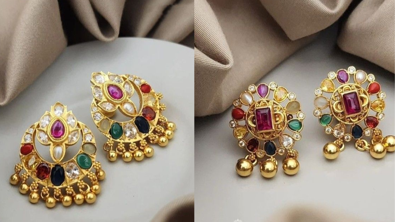 22kt Gold पर ये नवरत्न स्टोन झुमका डिजाइन 2025 के टॉप ट्रेंड में शुमार है। इसमें मल्टी कलर के नवरत्नों का इस्तेमाल किया गया है। आसपास सफेद मोती के साथ गुलाबी रंग का नग लगा है। साथ में फूल-पत्तियों की फ्लोरल मोटिफ डिजाइन है। ये इयररिंग्स स्टड और झुमका का परफेक्ट कॉम्बिनेशन है। इन्हें आप Handloom Saree के साथ वियर करें। ट्रेडिशनल साड़ी संग ऐसी डिजाइन बहुत गॉर्जियस लुक देती है।