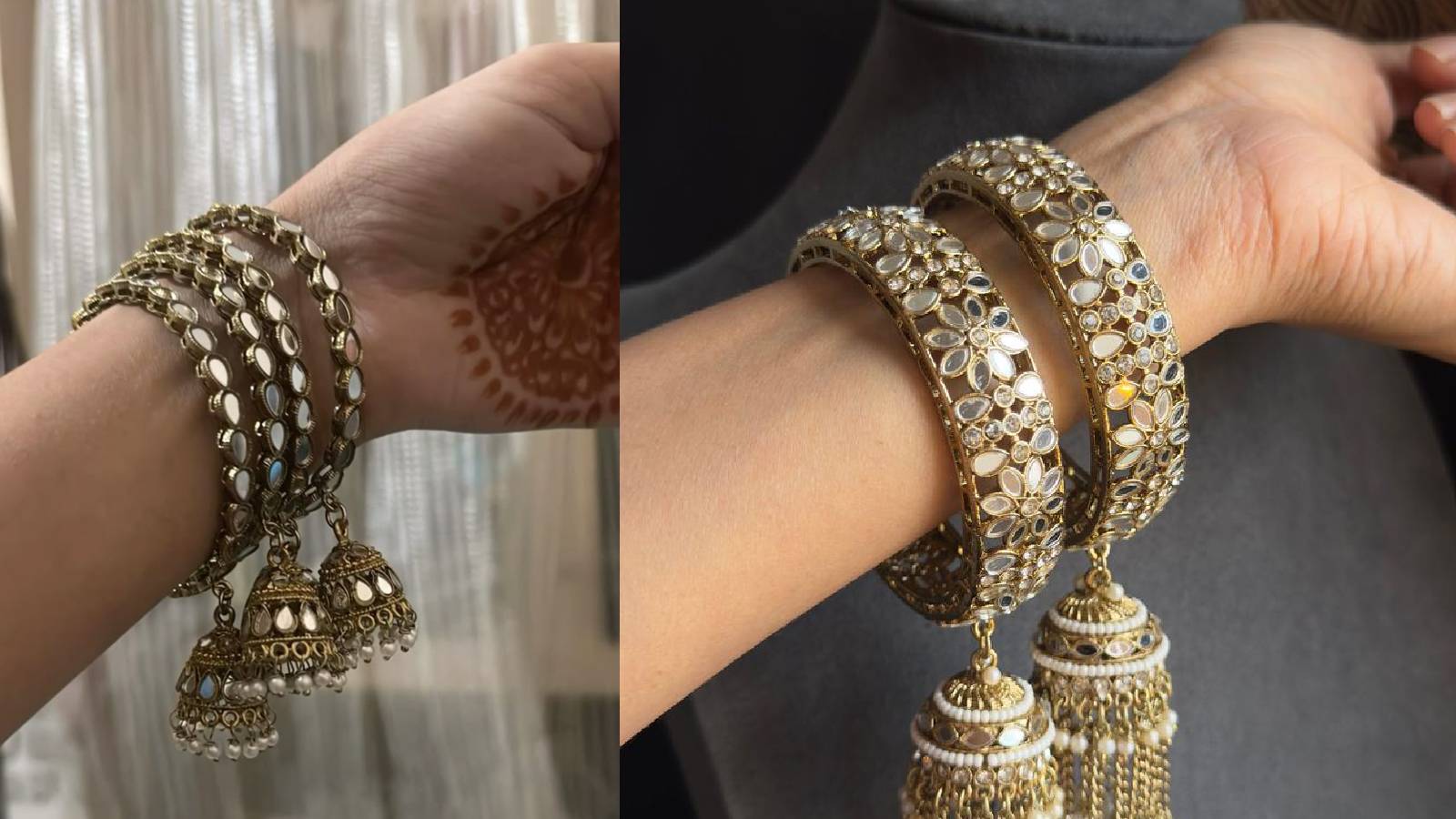 रोशनी में चकने वाले मिरर वर्क कंगन दिखने में खूब लगते हैं। आपको मिरर वर्क कंगन अपने बैंगल बॉक्स में जरूर रखने चाहिए ताकि मैटल से लेकर कांच की चूड़ियों तक में ऐसे बैंगल को पेयर कर खूबसूरत दिख सके। मिरर बैंगल में सिंपल और लटकन वाले डिजाइन चुनें। आपकी ड्रेस के हिसाब से बैंगल के डिजाइन का चयन करें। ऑनलाइन मिरर कंगन सेट हजार रु में मिल जाएगा। हैवी लुक चाहिए तो बजट बढ़ाना पड़ेगा।