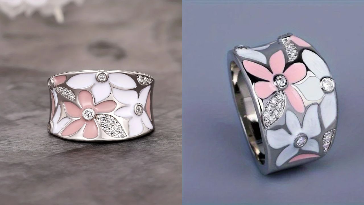 यदि आपको थोड़ा शाइन पसंद है, तो इस तरह के सिल्वर प्लेटेड जिरकॉन इनेमल फ्लावर रिंग की ये डिजाइन आपके लिए परफेक्ट है। इसमें आपको जिरकॉन की शाइन और पिंक इनमैल का सॉफ्ट टच मिलेगा, जो कैजुअल से लेकर फॉर्मल हर तरह के आउटफिट्स के साथ मैच करता हैं। रिंग बैंड की ये डिजाइन चौड़े पैटर्न में होती है, जो कि महिलाओं को स्टाइलिश और एलीगेंट लुक देती है। पहनने में हल्का और कंफर्टेबल होता है, जिसे आप आराम से पूरे दिन पहन सकती हैं।
