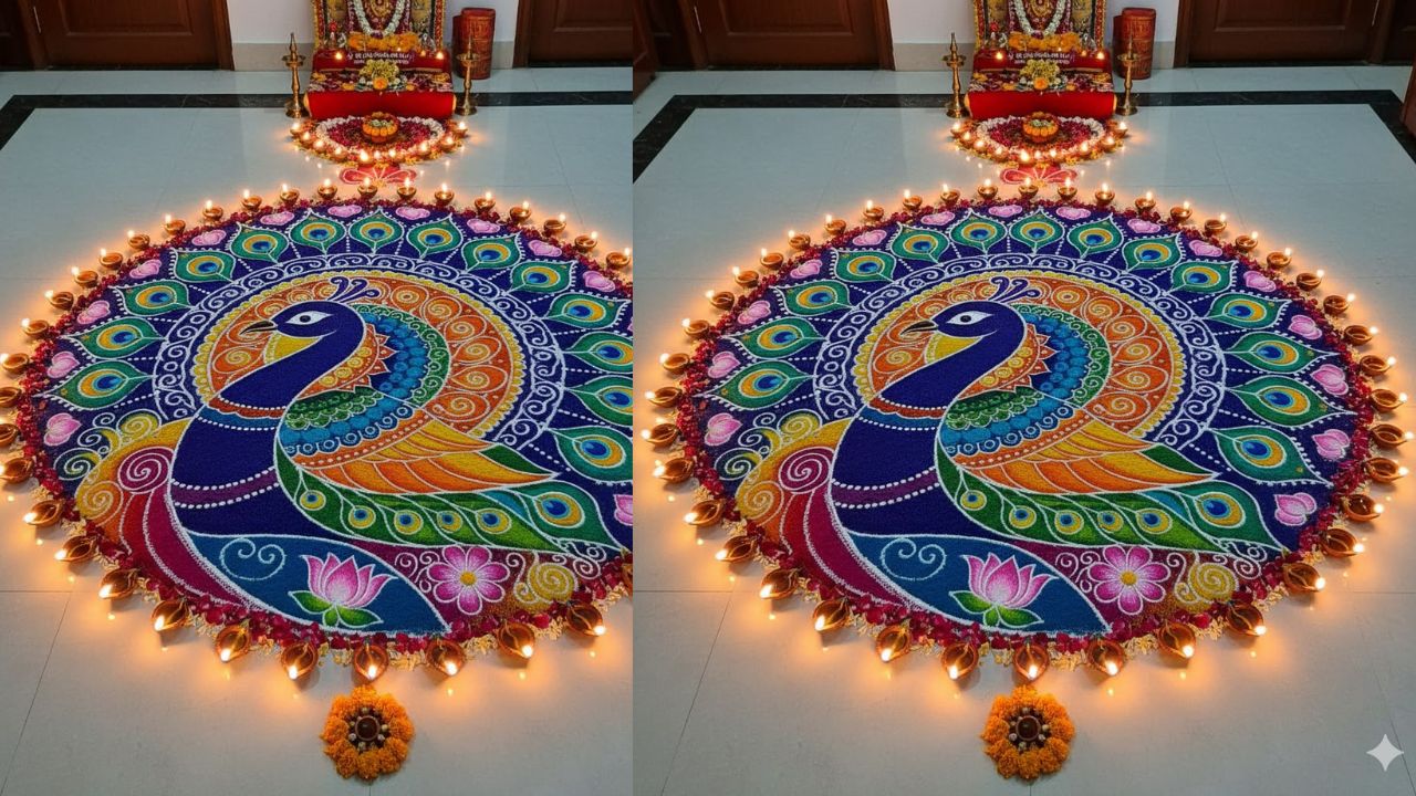 Peacock Rangoli Design: दिवाली में मोर डिजाइन रंगोली न बने ऐसा हो ही नहीं सकता। रंगोली की ये खूबसूरत डिजाइन आप बहुत ही आसानी से बना सकती हैं। यहां हम मोर रंगोली के 10 डिजाइन लाए हैं, जिसे प्रो रंगोली आर्टिस्ट और बिगनर्स दोनों ही बना सकते हैं।