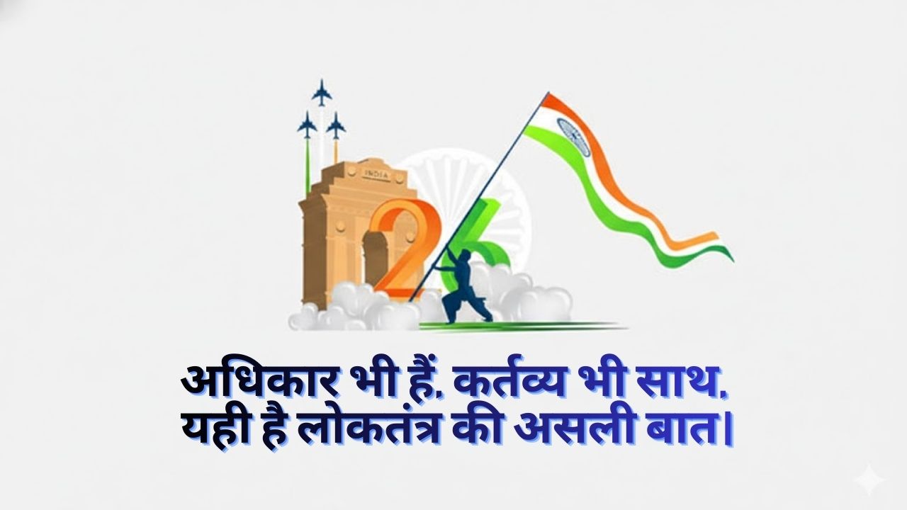 Republic Day shayri: गणतंत्र दिवस सिर्फ एक तारीख नहीं, बल्कि भारत के संविधान, लोकतंत्र और आज़ादी की गरिमा का उत्सव है। यह दिन हमें उन शहीदों और स्वतंत्रता सेनानियों की याद दिलाता है, जिनकी कुर्बानी से हमें एक संप्रभु और मजबूत भारत मिला। 26 जनवरी के इस पावन अवसर पर अगर आप अपने अपनों को दिल से छू जाने वाला संदेश भेजना चाहते हैं, तो ये छोटी-छोटी लेकिन गहरी 2 लाइन शायरी आपके जज़्बात बखूबी बयां करेंगी।