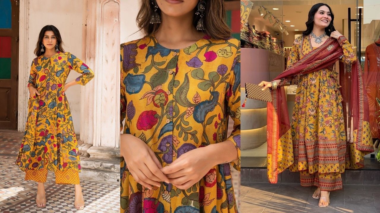 ऑफिस वियर के अलावा किसी एथनिक वियर या फिर शादी फंक्शन के लिए लाइट वेट लेकिन क्लासी और स्टाइलिश सूट चाहिए तो आप ऐसी सुंदर अनारकली सूट भी ले सकती हैं। बहुत सुंदर घेर के साथ-साथ इसमें कलमकारी प्रिंट है, जो कि देखने में आपकी सुंदरता बढ़ाएगी।