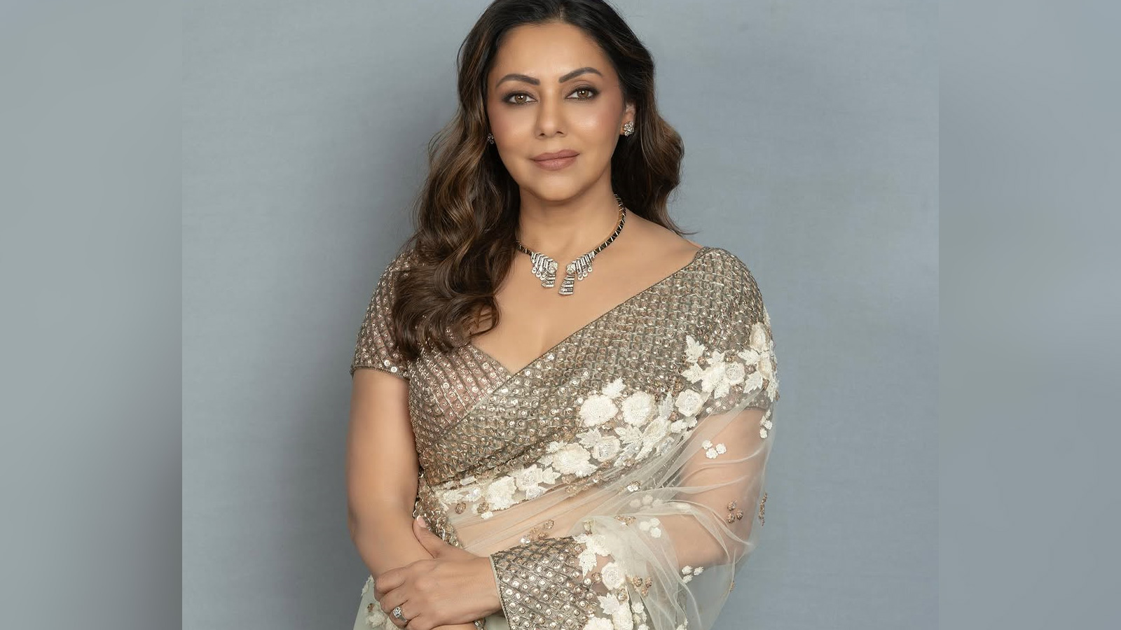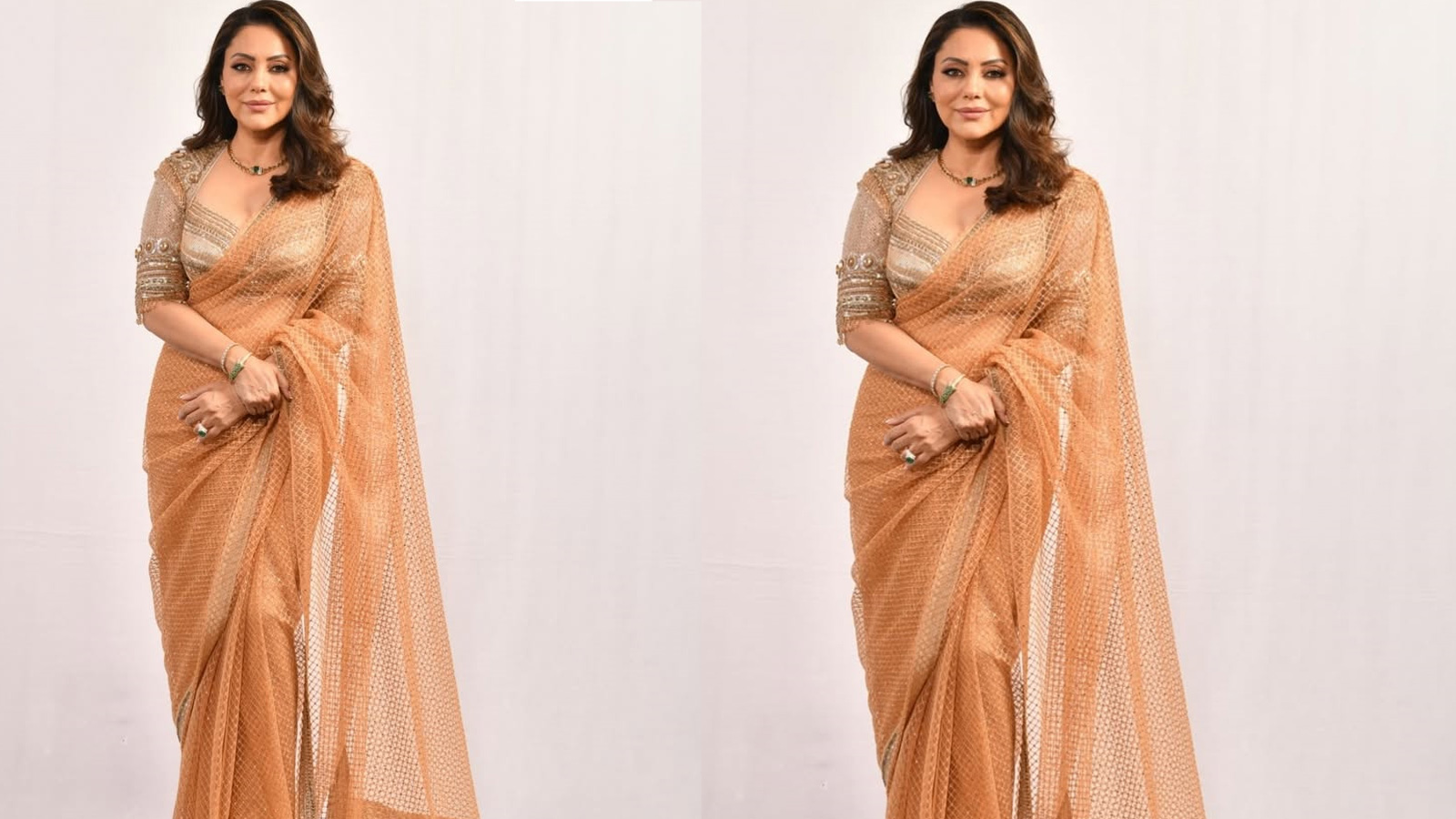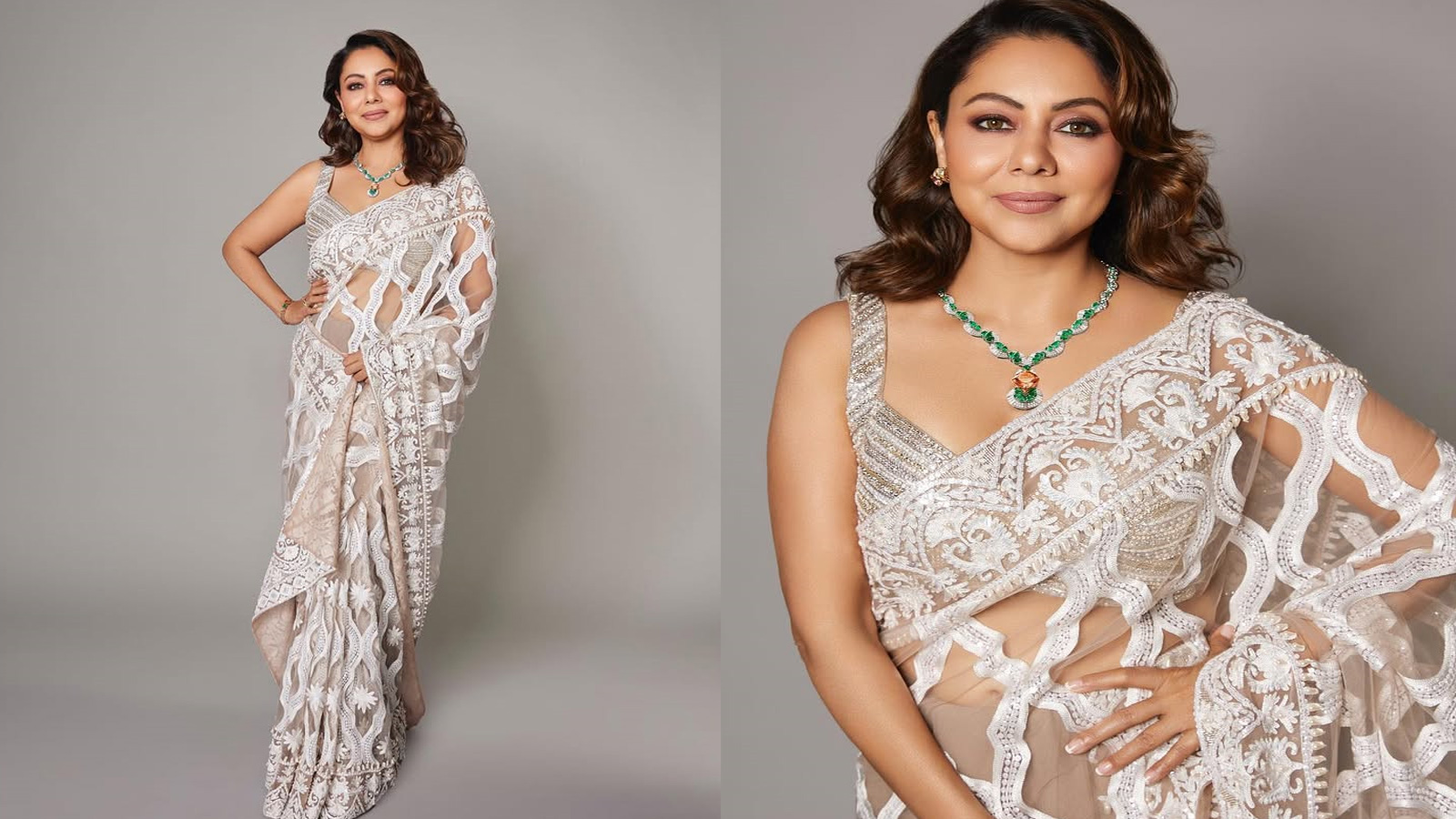 गौरी का V-नेक ब्लाउज लुक क्लासिक है। ये डिजाइन हैवी बस्ट को बैलेंस देता है और नेकलाइन को लंबा दिखाता है। यह साड़ी के साथ एलिगेंस और मॉडर्न टच दोनों लाता है। फेमस इंटीरियर डिजाइनर ने ट्रांसेपेरेंट साड़ी के साथ सीक्वेंस वर्क ब्लाउज पहना है जिसका स्लीव्स छोटा रखा गया है। पार्टी-फंक्शन के लिए गौरी का यह साड़ी ब्लाउज लुक परफेक्ट है।