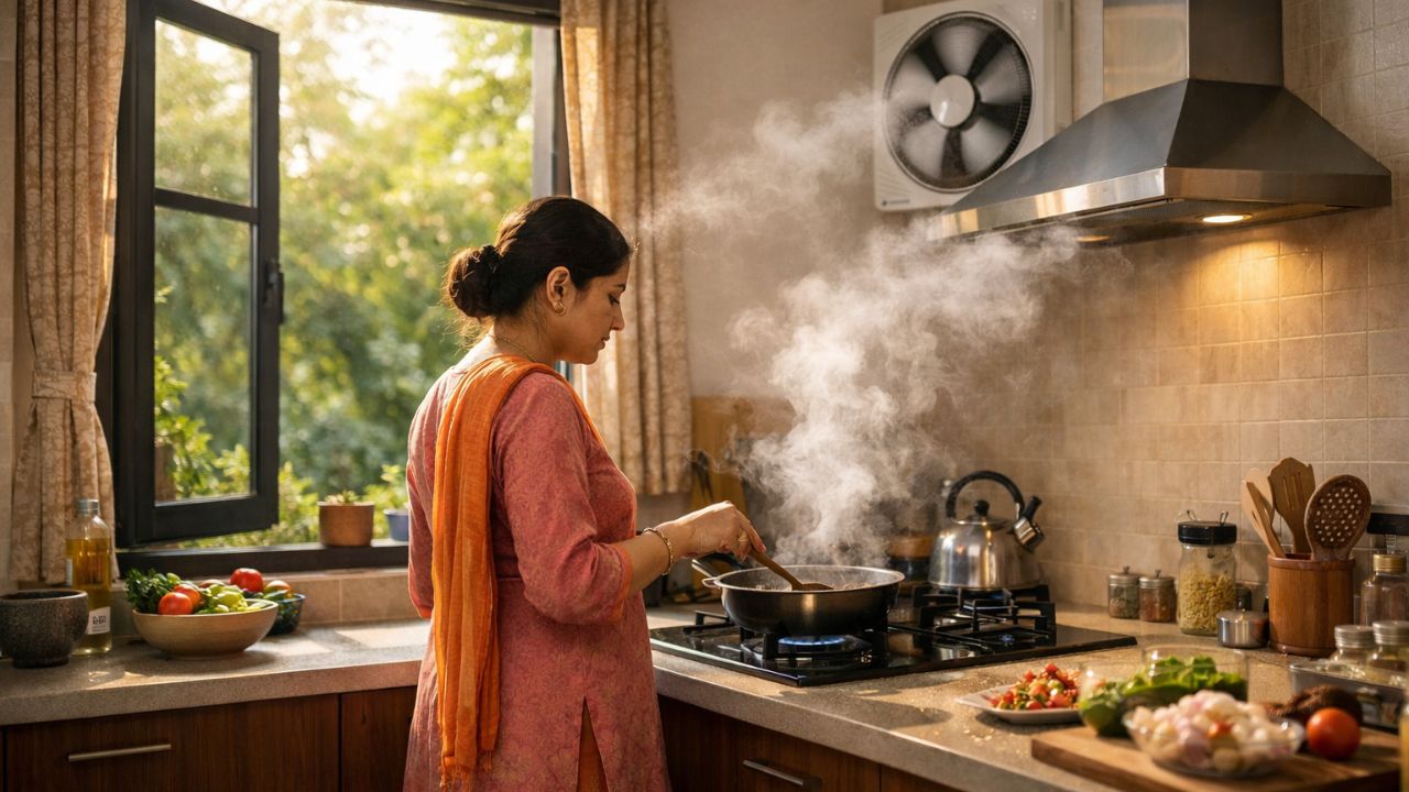 किचन में हवा का सही तरीके से आना-जाना बहुत जरूरी है। खिड़कियां और एग्जॉस्ट फैन हमेशा चालू रखें ताकि गर्म हवा बाहर निकल सके। अगर संभव हो तो सुबह या शाम के समय खाना बनाएं, जब तापमान कम होता है।