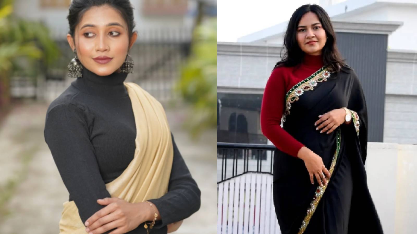 टर्टल-नेक स्टाइल हमेशा फैशन में रहता है। निटेड टर्टल-नेक ब्लाउज़ ठंड से बचाता है और आपको एक क्लीन और मॉडर्न एथनिक लुक देता है। यह प्लेन साड़ियों के साथ खास तौर पर ग्लैमरस लगता है।