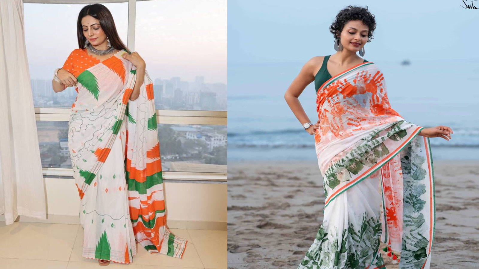 यहां पर दो साड़ी डिजाइंस दिए गए हैं, जिसे तिरंगा के कलर के पैटर्न में बनाया गया है। व्हाइट, ग्रीन और ऑरेंज मिक्स साड़ी काफी स्टाइल के साथ-साथ देशभक्ति के रस डूबे हुए नजर आती है। पहली डिजाइन में व्हाइट साड़ी के बॉर्डर पर ग्रीन-ऑरेंज झाड़ी पैटर्न बनाया गया है और बूटी का प्रिंट दिया गया है। वहीं दूसरे में हाथ का प्रिंट ग्रीन और ऑरेंज में बनाया गया है। इस तरह की साड़ी आप 500-3000 रुपए में खरीद सकती हैं।