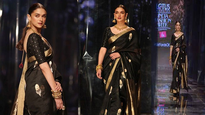 अदिति राव हैदरी ब्लैक कलर की सिल्क की साड़ी पहनकर ट्रेडिशनल लुक दे रही हैं। पेपर सिल्क साड़ी पर गोल्डन जरी का वर्क किया गया है। एक्ट्रेस ने मैचिंग ब्लाउज के साथ साड़ी को बिल्कुल ट्रेडिशनल तरीके से ड्रैप किया है। ओपन पल्लू ले रखा है। इसके साथ उन्होंने लो पोनीटेल बनाया है।अब जब आप इस तरह से साड़ी पहनकर सासू मां के पास जाएंगी तो वो नजर तो उतारेंगी ही।