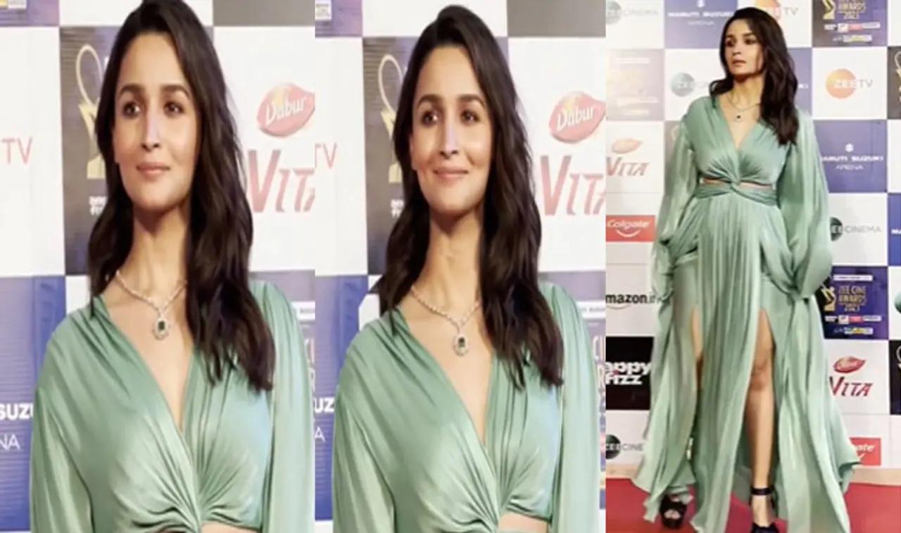 आलिया भट्ट ने लाइट ग्रीन गाउन डिजाइनर गाउन कैरी की हुई हैं। हाई स्लिट गाउन का नेक काफी डीप है। ये उनकी पोस्ट प्रेग्नेंसी ट्रांसफॉर्मेशन को दिखा रहा है।