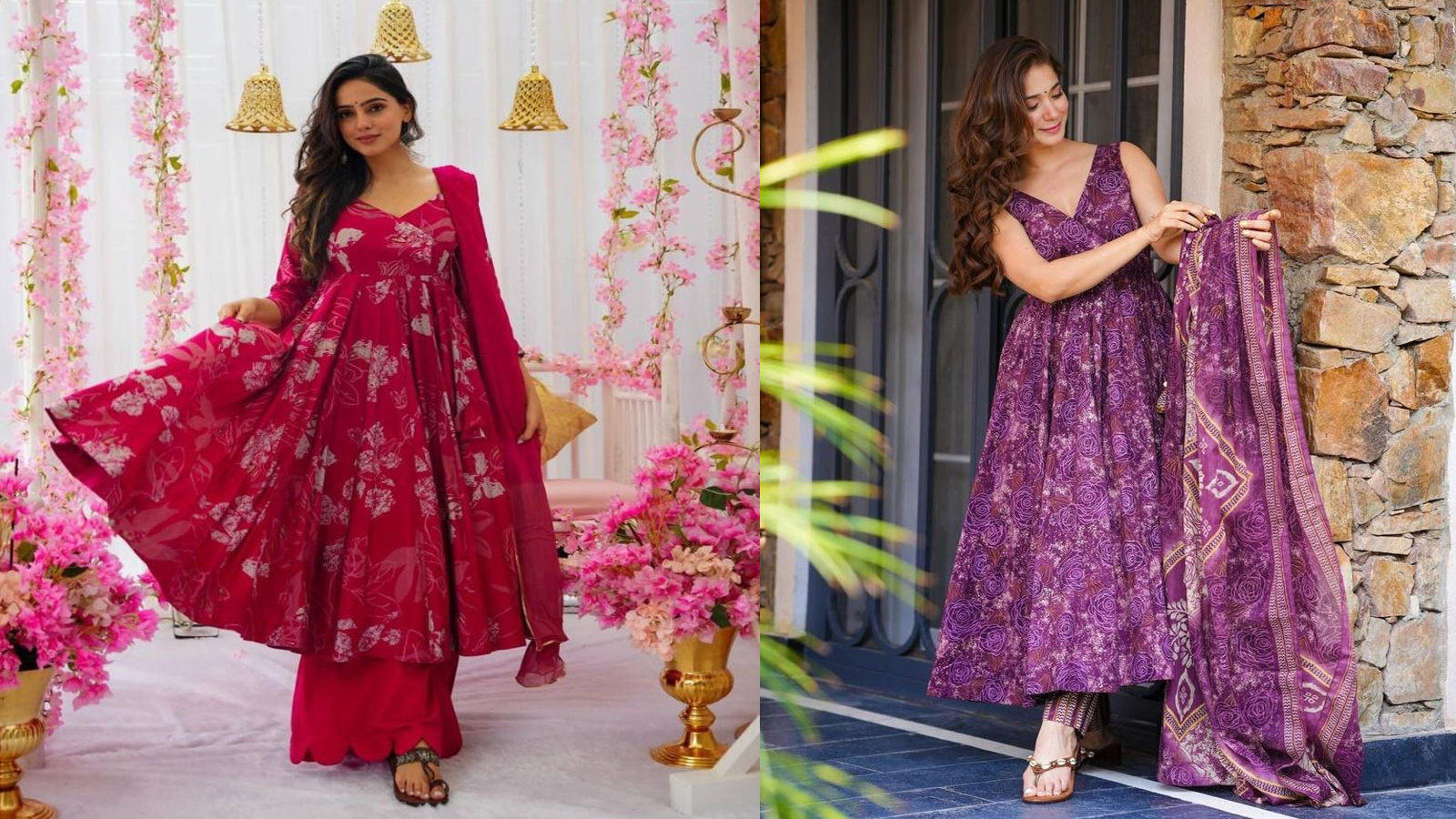 इस तस्वीर में दो खूबसूरत अनारकली सूट दिखाई दे रहे हैं। मैरुन और ब्लू कलर की कॉम्बिनेश वाले अनारकली सूट में छोटे-छोटे फूलों के प्रिंट्स हैं। स्लीवलेस सूट के साथ मैचिंग दुपट्टा जोड़ा गया है, जो लुक को बेहद फ्रेश और कैजुअल बनाता है। वहीं दूसरा अनारकली सूट बैंगनी रंग का है, जिसमें बंधनी जैसा पैटर्न और पिंक डिटेलिंग है। इसमें लॉन्ग स्लीव्स हैं और स्क्वायर नेकलाइन के चारों ओर हल्की एम्ब्रॉयडरी दी गई है, जो इसे ट्रेडिशनल और स्टाइलिश लुक देता है। दोनों सूट फ्लोइंग और ए-लाइन कट के हैं, जो पहनने वाले को एलिगेंट और ग्रेसफुल लुक देता है।