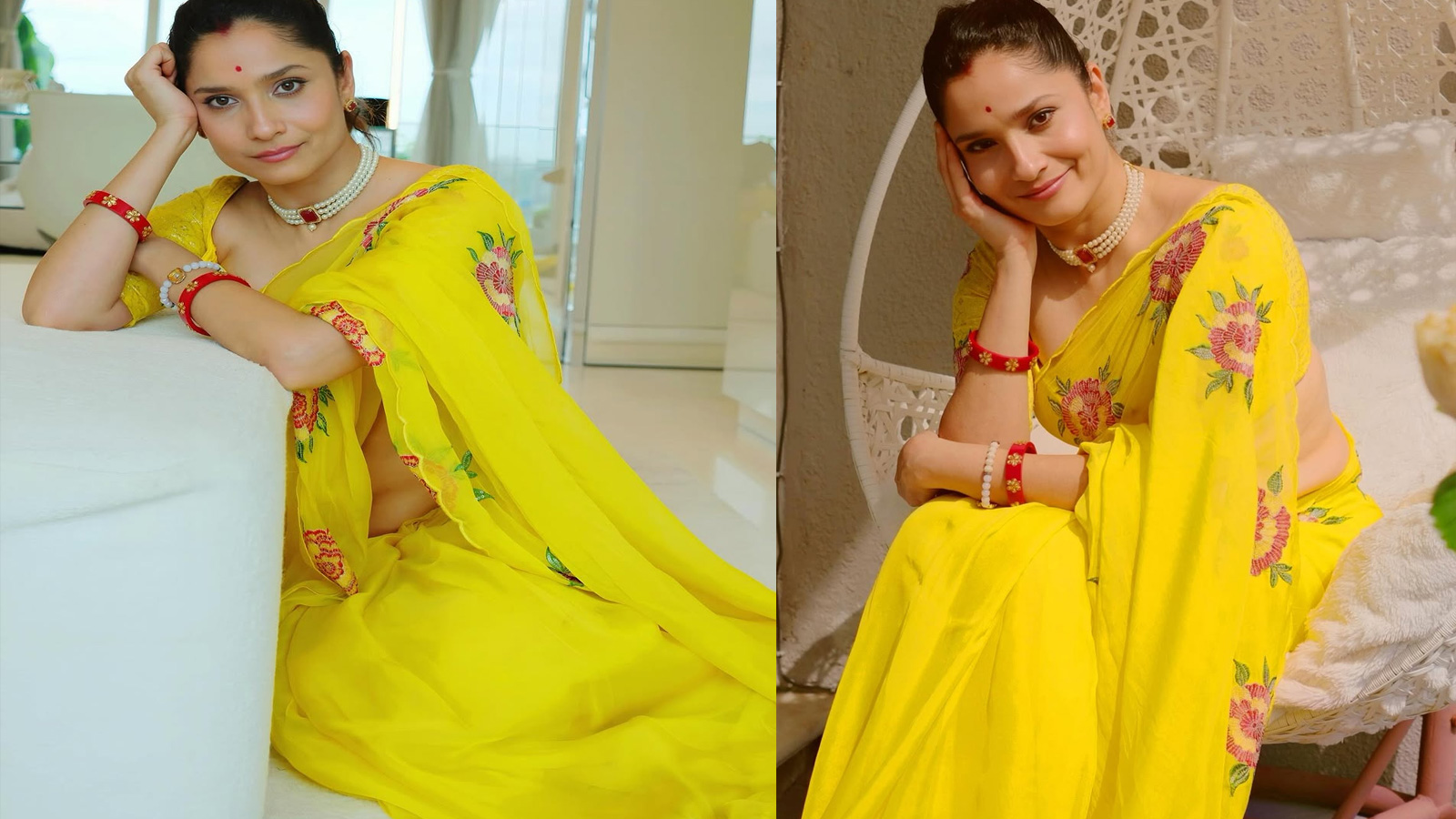 साड़ी के साथ अंकिता लोखंडे ने मिनिमल मेकअप लुक अपनाया है और माथे पर छोटी सी बिंदी लगाई है, जो उनके ट्रेडिशनल अंदाज को खूबसूरती से उभारती है। बालों को उन्होंने सिम्पल पोनीटेल स्टाइल में बांधा है। गले में पर्ल चोकर नेकलेस और कानों में स्टड इयररिंग्स के साथ उन्होंने अपने लुक को कंप्लीट किया है। वहीं, हाथों में पहनी हुई रेड बैंगल्स उनकी येलो साड़ी के साथ परफेक्ट कॉन्ट्रास्ट लुक क्रिएट कर रही हैं।