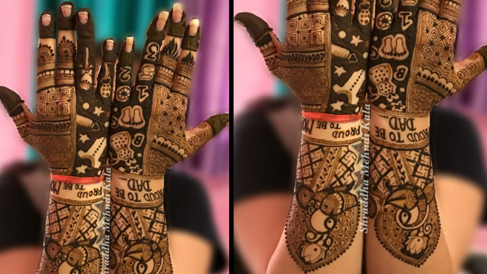 बैक हैंड पर आप इस तरह से बच्चों के फुटप्रिंट, कपड़े की डिजाइन मेहंदी से बनवाकर भी ट्रेंडी मेहंदी लगा सकती हैं और प्राउड मॉम और डैड बीच में लिखवाकर खूबसूरत सा मेहंदी लुक अपने हाथों को दें। मैटरनिटी फोटोशूट के दौरान इस तरह की मेहंदी हाथों पर बहुत ही खूबसूरत लगती हैं। तो आप भी अगर अपने बेबी शावर के लिए मेहंदी की तलाश में हैं, तो इन मेहंदी लुक्स को ट्राई कर सकते हैं।