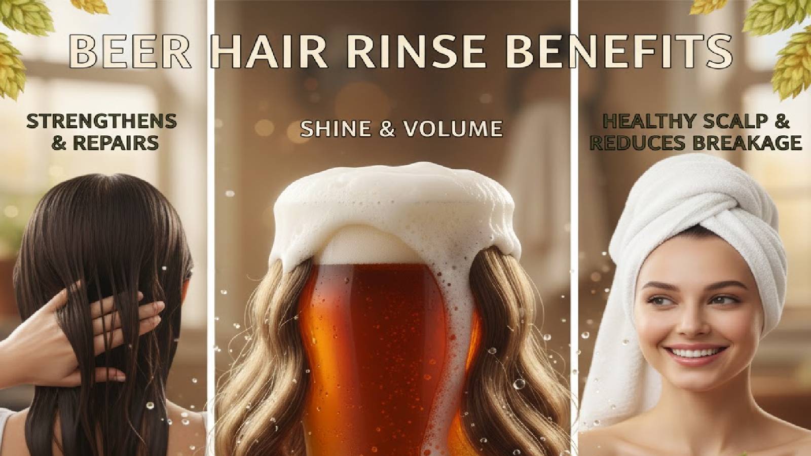बीयर का इस्तेमाल बालों की ग्रोथ को बढ़ाने में मदद कर सकता है। यह बालों के रेशों को मजबूत बनाता है, बालों का झड़ना कम करता है, और बालों को चमकदार और घना बनाता है। बीयर आमतौर पर हॉप्स (ह्यूमुलस ल्यूपुलस पौधे के फूल) और जौ से बनती है, ये दोनों ही बालों के स्वास्थ्य के लिए फायदेमंद हैं। बीयर हेयर रिंस खराब बालों को ठीक करने में मदद कर सकता है। यह बालों को हाइड्रेट करता है, बालों के शाफ्ट को मजबूत बनाता है, और फ्रिज़ को कम करता है।
