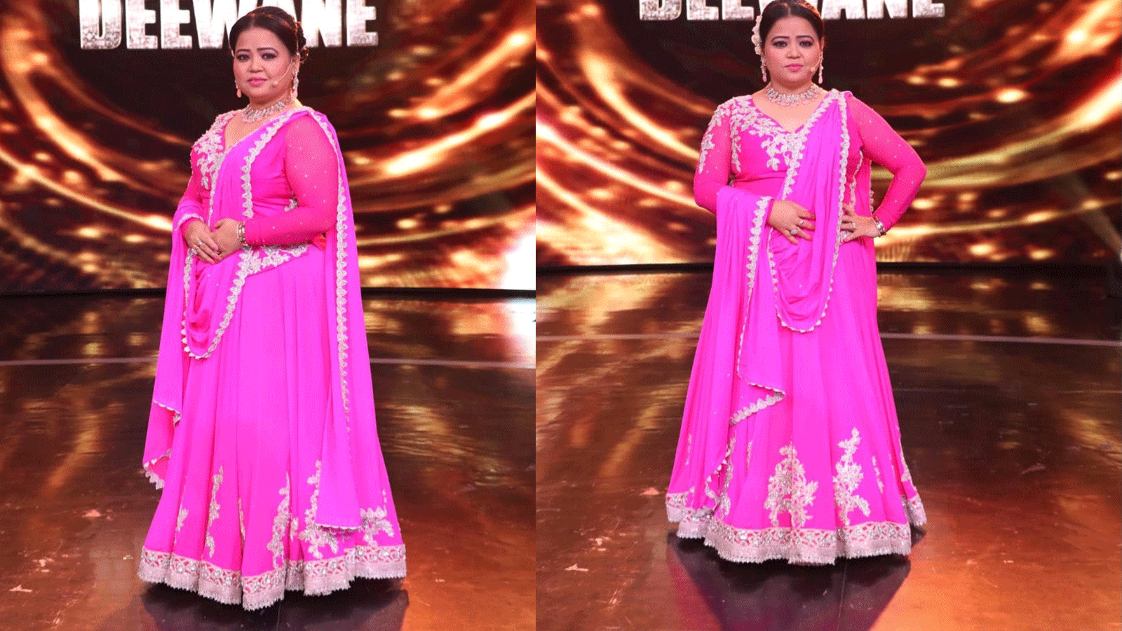 पिंक अनारकली सूट में भारती सिंह बहुत ही प्यारी लग रही हैं। घेरेदार सूट के बॉर्डर पर सिल्वर गोटापट्टी जोड़ा गया है। बीच-बीच में भी सिल्वर पैचवर्क दिया गया है। गले पर सिल्वर जरी से फूल और पत्ती बनाए गए हैं। लॉफ्टर क्वीन का यह सूट शादी फंक्शन के लिए परफेक्ट है। इसके साथ आप हैवी ज्वेलरी भी जोड़ सकती हैं।