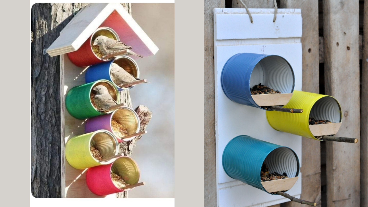 तस्वीर में दो अलग-अलग तरह के टिन कैन बर्ड फीडर दिखाएं गए हैं, जो किचन में रखे मसालों के डिब्बों से आसानी बनाएं जा सकते हैं। आप छोटे-छोटे 6 डिब्बों को हैगिंग पैटर्न में लगाकर लकड़ी के टुकड़े में इसे वर्टिकली लगा दें। इसमें अंदर की ओर लकड़ी भी रखी है, जिसमें पक्षी आसानी से बैठ सकते हैं। यह घर को क्लासी-कूल लुक देने के लिए बेस्ट है, साथ ही आप इसे हर मौसम में यूज कर पाएंगे।