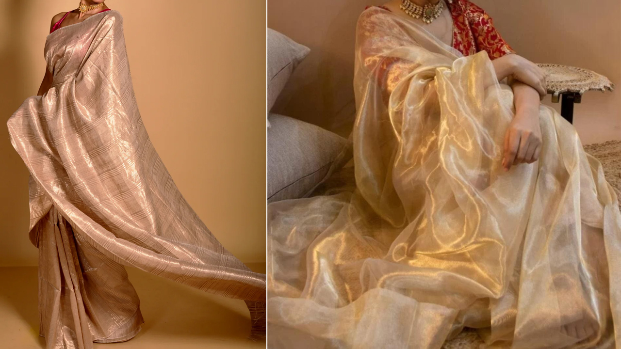 बनारसी टिश्यू साड़ी दरअसल बनारसी बुनाई की ही एक खास शैली है, जिसमें कपड़े के ताने-बाने में महीन मेटैलिक धागों का इस्तेमाल होता है। इसका फैब्रिक टिश्यू जैसा हल्का और फ्लोइंग होता है, लेकिन उस पर बने जरी या सिल्वर-गोल्ड थ्रेड वर्क के कारण यह बहुत रिच और ग्रैंड लुक देती है। ये साड़ियां इतनी हल्की होती हैं कि शादी-ब्याह के फंक्शन में घंटों पहने रहने पर भी बोझ महसूस नहीं होता।