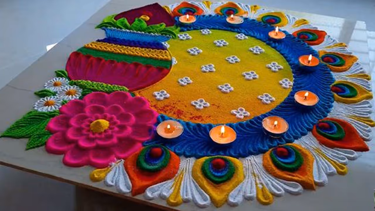 अगर आप कुछ यूनिक सा रंगोली बनाना चाहते हैं तो फिर इस तरह की रंगोली डिजाइन को ट्राई कर सकती हैं। गन्ना, केला, नारियल समेत कलश को बहुत खूबसूरती से इस रंगोली में बनाया गया है।